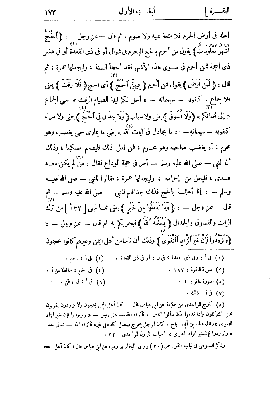 (8) أخرج الواحدي عن عكرمة عن ابن عباس قال: كان أهل اليمن يحجون ولا يزودون يقولون نحن المتوكلون فإذا قدموا مكة سألوا الناس. فأنزل الله- عَزَّ وَجَلّ- وَتَزَوَّدُوا فَإِنَّ خَيْرَ الزَّادِ التَّقْوى وقال عطاء بن أبى رباح: كان الرجل يخرج فيحمل كله على غيره فأنزل الله- تعالى- وَتَزَوَّدُوا فَإِنَّ خَيْرَ الزَّادِ التَّقْوى أسباب النزول للواحدي: 32.