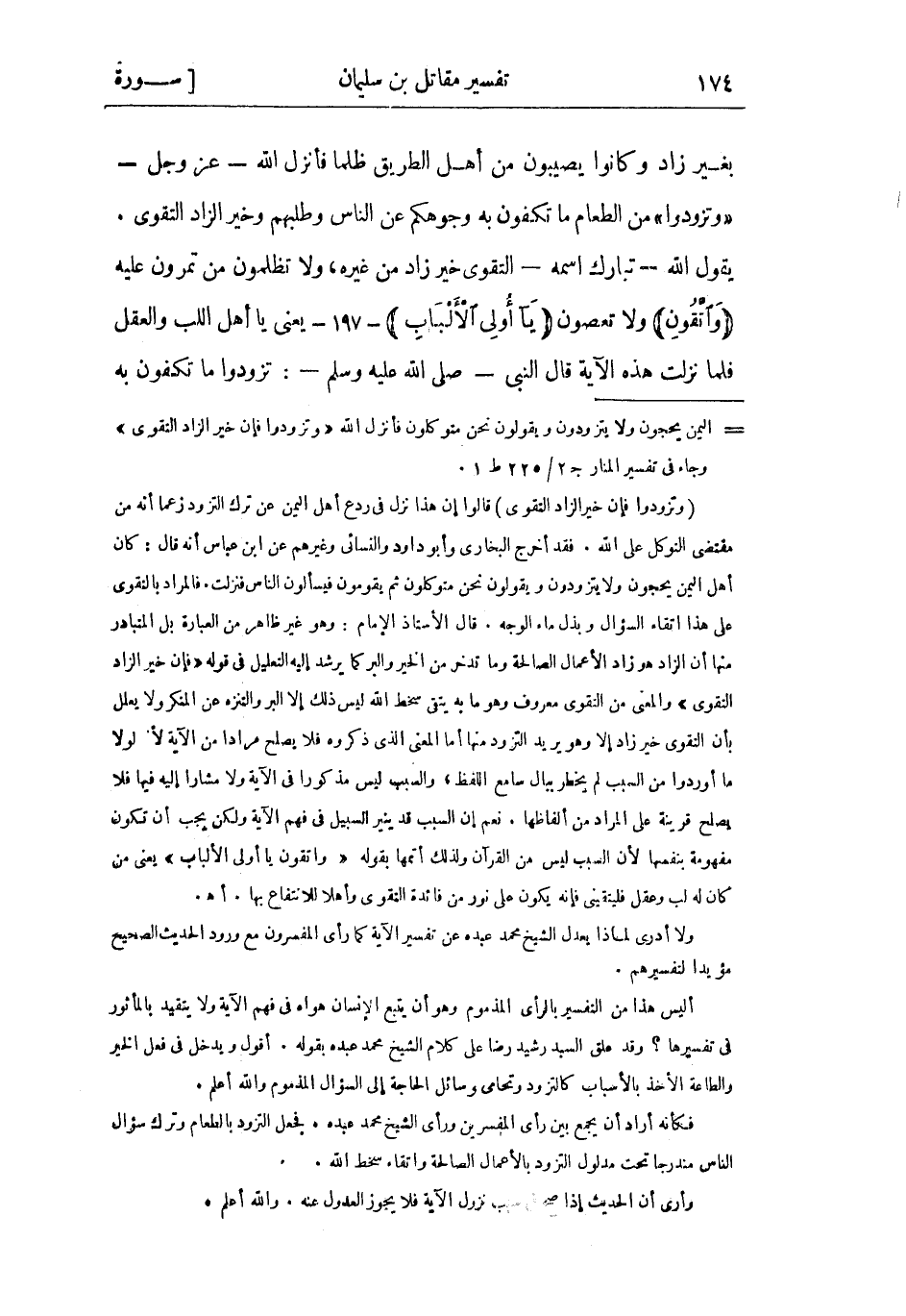 أليس هذا من التفسير بالرأى المذموم وهو أن يتبع الإنسان هواه فى فهم الآية ولا يتقيد بالمأثور فى تفسيرها؟ وقد علق السيد رشيد رضا على كلام الشيخ محمد عبده بقوله. أقول ويدخل فى فعل الخير والطاعة الأخذ بالأسباب كالتزود وتحامى وسائل الحاجة إلى السؤال المذموم والله أعلم.