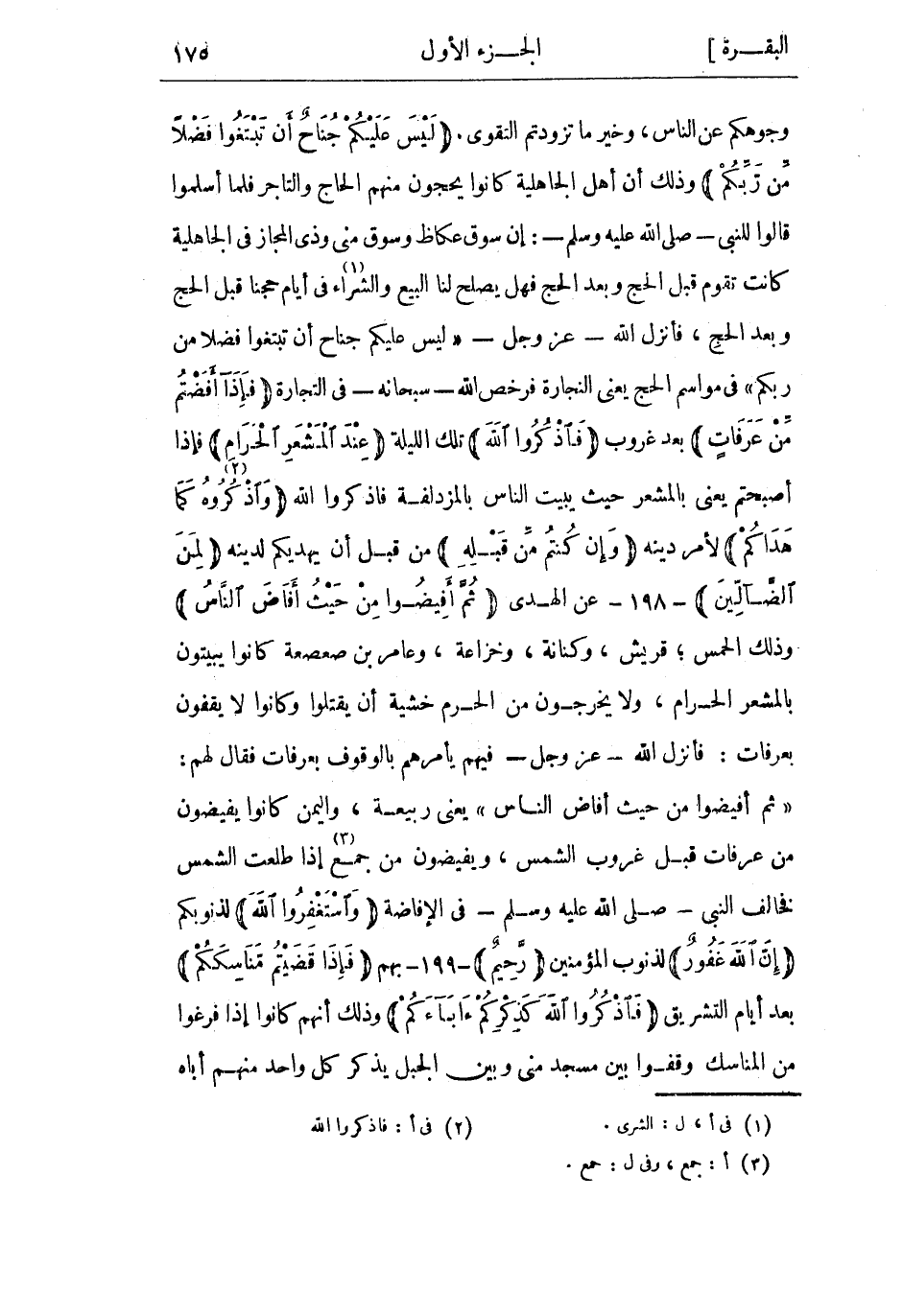 لَيْسَ عَلَيْكُمْ جُناحٌ أَنْ تَبْتَغُوا فَضْلًا مِنْ رَبِّكُمْ وذلك أن أَهْل الْجَاهِلِيَّة كانوا يحجون منهم الحاج والتاجر فَلَمَّا أسلموا قَالُوا للنبي- صَلَّى اللَّهُ عَلَيْهِ وَسَلَّمَ-: إن سوق عكاظ وسوق منى وذي المجاز فِي الْجَاهِلِيَّة كَانَتْ تقوم قبل الحج وبعد الحج فهل يصلح لنا البيع والشراء «1» في أيام حجنا قبل الحج وبعد الحج، فأنزل اللَّه- عَزَّ وَجَلّ- لَيْسَ عَلَيْكُمْ جُناحٌ أَنْ تَبْتَغُوا فَضْلًا مِنْ رَبِّكُمْ فى مواسم الحج يعنى النجارة فرخص اللَّه- سُبْحَانَهُ- فِي التجارة فَإِذا أَفَضْتُمْ مِنْ عَرَفاتٍ بعد غروب فَاذْكُرُوا اللَّهَ تِلْكَ الليلة عِنْدَ الْمَشْعَرِ الْحَرامِ فإذا أصبحتم يعني بالمشعر حيث يبيت الناس بالمزدلفة فاذكروا اللَّه وَاذْكُرُوهُ «2» كَما هَداكُمْ لأمر دينه وَإِنْ كُنْتُمْ مِنْ قَبْلِهِ من قبل أن يهديكم لدينه لَمِنَ الضَّالِّينَ- 198- عن الهدى ثُمَّ أَفِيضُوا مِنْ حَيْثُ أَفاضَ النَّاسُ وذلك الحمس، قريش، وكنانة، وخزاعة، وعامر بن صعصعه كانوا يبيتون بالمشعر الحرام، وَلا يخرجون من الحرم خشية أن يقتلوا وكانوا لا يقفون بعرفات: فأنزل اللَّه- عَزَّ وَجَلّ- فيهم يأمرهم بالوقوف بعرفات فَقَالَ لهم:
