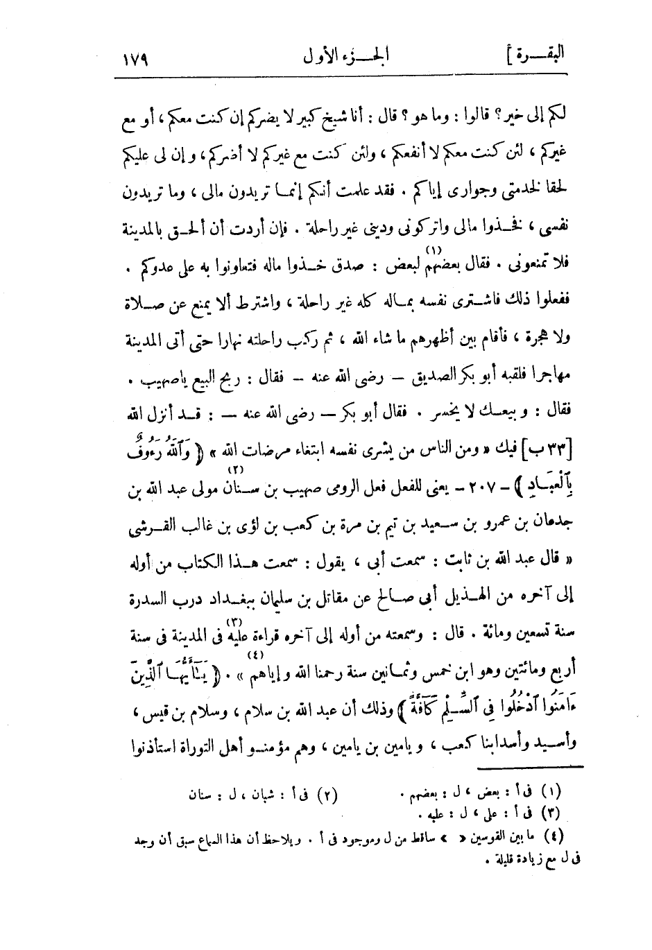 فَقَالَ: وبيعك لا يخسر. فَقَالَ أَبُو بَكْر- رَضِيَ اللَّه عَنْهُ-: قَدْ أنزل اللَّه [33 ب] فيك وَمِنَ النَّاسِ مَنْ يَشْرِي نَفْسَهُ ابْتِغاءَ مَرْضاتِ اللَّهِ وَاللَّهُ رَؤُفٌ بِالْعِبادِ- 207- يعني للفعل فعل الرومي صُهَيْب بن سنان «2» مولى عبد الله بن جدعان بن عمرو بن سَعِيد بن تيم بن مرة بن كَعْب بن لؤي بن غالب الْقُرَشِيّ «قَالَ عَبْد اللَّه بن ثَابِت: سَمِعْتُ أَبِي، يَقُولُ: سَمِعْتُ هَذَا الكتاب من أوله إلى آخره من الْهُذَيْلِ أَبِي صَالِح عن مُقَاتِلٍ بن سُلَيْمَان ببغداد درب السدرة سنة تسعين ومائة. قَالَ: وسمعته من أوله إلى آخره قراءة عَلَيْه «3» فِي المدينة فِي سنة أربع ومائتين وَهُوَ ابْن خمس وثمانين سنة رحمنا الله وإياهم» «4» . يا أَيُّهَا الَّذِينَ آمَنُوا ادْخُلُوا فِي السِّلْمِ كَافَّةً وذلك أن عَبْد اللَّه بن سلام، وسلام بن قَيْس، وأسيد وأسد ابنا كَعْب، ويامين بن يامين، وهم مؤمنو أَهْل التوراة استأذنوا