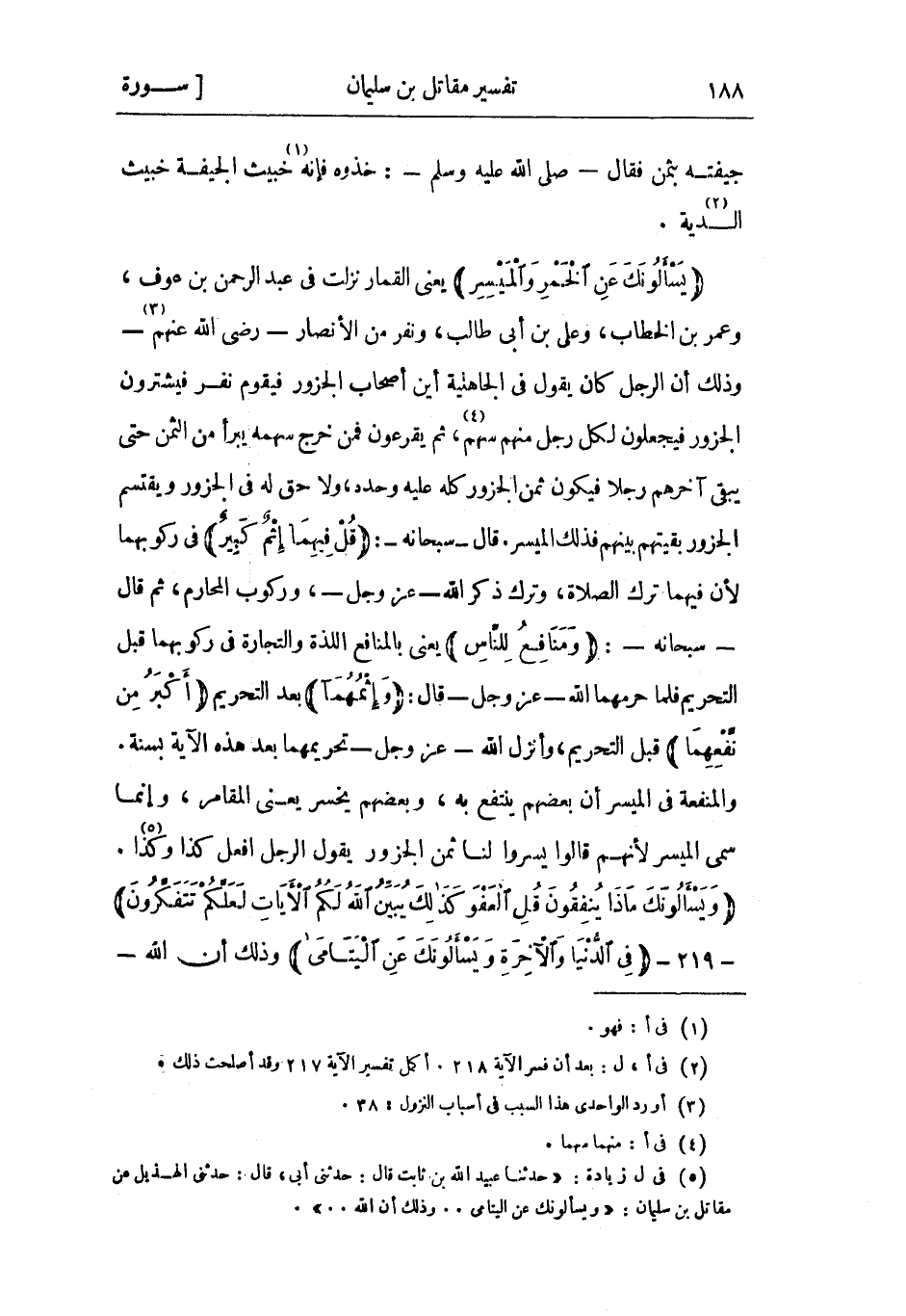يَسْئَلُونَكَ عَنِ الْخَمْرِ وَالْمَيْسِرِ يعني القمار نزلت فِي عَبْد الرَّحْمَن بن عَوْف، وعمر بن الخَطَّاب، وعلي بن أَبِي طَالِب، ونفر من الأَنْصَار- رَضِيَ اللَّه عَنْهُمْ «3» - وذلك أن الرَّجُل كان يَقُولُ فِي الْجَاهِلِيَّة أَيْنَ أصحاب الجزور فيقوم نفر فيشترون الجزور فيجعلون لكل رَجُل منهم سهم «4» ، ثُمّ يقرعون فَمنْ خرج سهمه يبرأ من الثمن حَتَّى يبقى آخرهم رَجُلا فيكون ثمن الجزور كله عَلَيْه وحده، وَلا حق لَهُ فِي الجزور ويقتسم الجزور بقيتهم بينهم فذلك الميسر. قَالَ- سبحانه-: قُلْ فِيهِما إِثْمٌ كَبِيرٌ فِي ركوبهما لأن فيهما ترك الصَّلاة، وترك ذكر اللَّه- عَزَّ وَجَلّ-، وركوب المحارم، ثُمّ قَالَ- سُبْحَانَهُ-: وَمَنافِعُ لِلنَّاسِ يعني بالمنافع اللذة والتجارة فِي ركوبهما قبل التحريم فَلَمَّا حرمهما اللَّه- عَزَّ وَجَلّ- قَالَ: وَإِثْمُهُما بعد التحريم أَكْبَرُ مِنْ نَفْعِهِما قبل التحريم، وأنزل اللَّه- عَزَّ وَجَلّ- تحريمهما بعد هَذِهِ الآية بسنة.