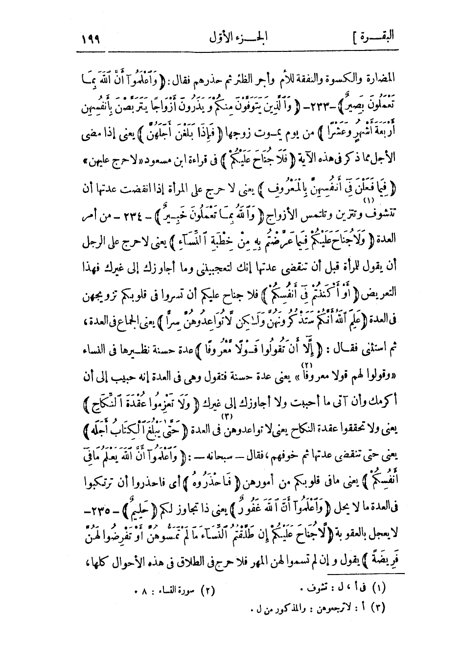 المضارة والكسوة والنفقة للأم وأجر الظئر ثُمّ حذرهم فَقَالَ: وَاعْلَمُوا أَنَّ اللَّهَ بِما تَعْمَلُونَ بَصِيرٌ- 233- وَالَّذِينَ يُتَوَفَّوْنَ مِنْكُمْ وَيَذَرُونَ أَزْواجاً يَتَرَبَّصْنَ بِأَنْفُسِهِنَّ أَرْبَعَةَ أَشْهُرٍ وَعَشْراً من يوم يموت زوجها فَإِذا بَلَغْنَ أَجَلَهُنَّ يعني إذا مضى الأجل مما ذكر فِي هَذِهِ الآية فَلا جُناحَ عَلَيْكُمْ فِي قراءة ابْن مَسْعُود «لا حرج عليهن» فِيما فَعَلْنَ فِي أَنْفُسِهِنَّ بِالْمَعْرُوفِ يعني لا حرج عَلَى المرأة إذا انقضت عدتها أن تتشوف «1» وتتزين وتلتمس الأزواج وَاللَّهُ بِما تَعْمَلُونَ خَبِيرٌ- 234- من أمر العدة وَلا جُناحَ عَلَيْكُمْ فِيما عَرَّضْتُمْ بِهِ مِنْ خِطْبَةِ النِّساءِ يعني لا حرج عَلَى الرَّجُل أن يَقُولُ للمرأة قبل أن تنقضي عدتها إنك لتعجبينني وما أجاوزك إلى غيرك فهذا التعريض أَوْ أَكْنَنْتُمْ فِي أَنْفُسِكُمْ فلا جناح عليكم أن تسروا فِي قلوبكم تزويجهن فِي العدة عَلِمَ اللَّهُ أَنَّكُمْ سَتَذْكُرُونَهُنَّ وَلكِنْ لا تُواعِدُوهُنَّ سِرًّا يعني الجماع في العدة ثم استثنى فقال: إِلَّا أَنْ تَقُولُوا قَوْلًا مَعْرُوفاً عدة حسنة نظيرها فِي النّساء وَقُولُوا لَهُمْ قَوْلًا مَعْرُوفاً «2» يعني عدة حسنة فتقول وهي فِي العدة إنَّه حبيب إليّ أن أكرمك وأن آتي ما أحببت وَلا أجاوزك إلى غيرك وَلا تَعْزِمُوا عُقْدَةَ النِّكاحِ يعني وَلا تحققوا عقدة النكاح يعني لا تواعدوهن «3» فِي العدة حَتَّى يَبْلُغَ الْكِتابُ أَجَلَهُ يعني حَتَّى تنقضي عدتها ثُمّ خوفهم، فَقَالَ- سُبْحَانَهُ-: وَاعْلَمُوا أَنَّ اللَّهَ يَعْلَمُ مَا فِي أَنْفُسِكُمْ يعني ما فِي قلوبكم من أمورهن فَاحْذَرُوهُ أي فاحذروا أن ترتكبوا فِي العدة ما لا يحل وَاعْلَمُوا أَنَّ اللَّهَ غَفُورٌ يعني ذا تجاوز لَكُمْ حَلِيمٌ- 235- لا يعجل بالعقوبة لا جُناحَ عَلَيْكُمْ إِنْ طَلَّقْتُمُ النِّساءَ مَا لَمْ تَمَسُّوهُنَّ أَوْ تَفْرِضُوا لَهُنَّ فَرِيضَةً يَقُولُ وإن لَمْ تسموا لهن المهر فلا حرج فِي الطلاق فِي هَذِهِ الأحوال كلها،