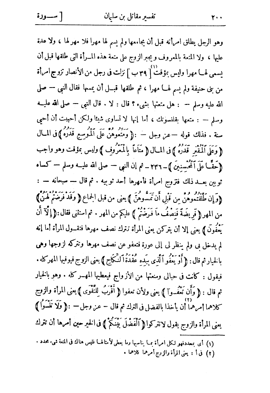 وَهُوَ الرَّجُل يطلق امرأته قبل أن يجامعها وَلَم يسم لها مهرا فلا مهر لها، وَلا عدة عَلَيْهَا، وَلا المتعة بالمعروف ويجبر الزوج عَلَى متعة هَذِهِ المرأة التي طلقها قبل أن يسمي لها مهرا وليس بمؤقت «1» [39 ب]