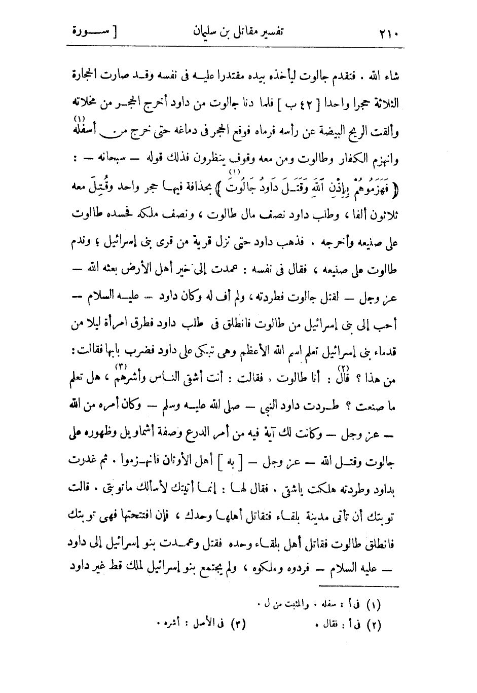 فَهَزَمُوهُمْ بِإِذْنِ اللَّهِ وَقَتَلَ داوُدُ جالُوتَ «2» بحذافة فيها حجر واحد وقُتِل معه ثلاثون ألفا، وطلب دَاوُد نصف مال طالوت، ونصف ملكه فحسده طالوت عَلَى صنيعه وأخرجه. فذهب دَاوُد حَتَّى نزل قرية من قرى بني إِسْرَائِيل، وندم طالوت عَلَى صنيعه، فَقَالَ فِي نفسه: عمدت إلى خير أَهْل الأرض بعثه اللَّه- عَزَّ وَجَلّ- لقتل جالوت فطردته، وَلَم أفِ لَهُ وكان دَاوُد- عَلَيْه السَّلام- أحبّ إلى بني إِسْرَائِيل من طالوت فانطلق فِي طلب دَاوُد فطرق امرأة ليلا من قدماء بني إِسْرَائِيل تعلم اسم اللَّه الأعظم وهي تبكي عَلَى دَاوُد فضرب بابها فقالت:
