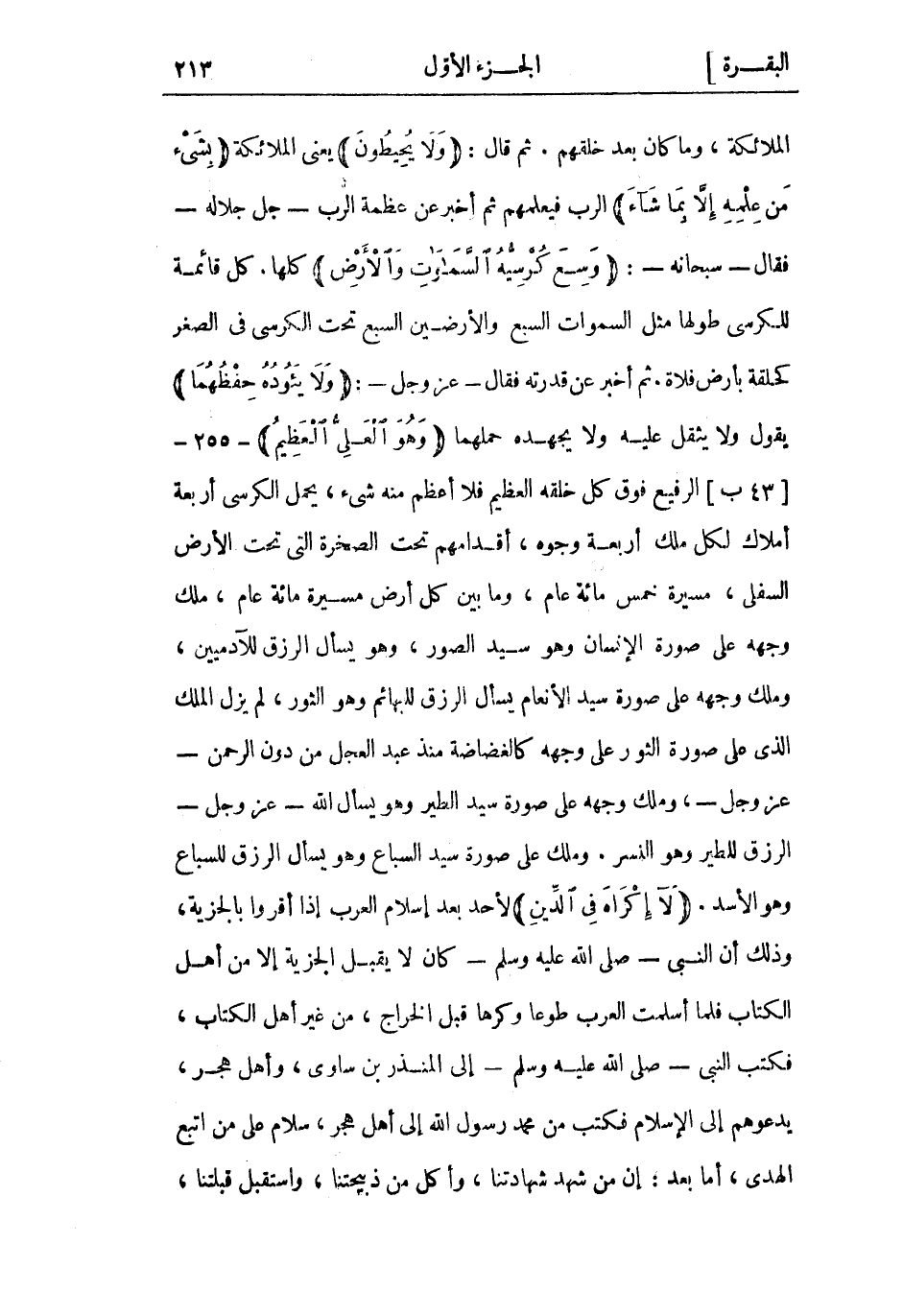 الملائكة، وما كان بعد خلقهم. ثُمّ قَالَ: وَلا يُحِيطُونَ يعني الملائكة بِشَيْءٍ مِنْ عِلْمِهِ إِلَّا بِما شاءَ الرب فيعلمهم ثم أخبر عن عظمة الرب- جل جلاله- فقال- سبحانه-: وَسِعَ كُرْسِيُّهُ السَّماواتِ وَالْأَرْضَ كلها. كل قائمة للكرسي طولها مثل السموات السبع والأرضين السبع تحت الكرسي فى الصغر كحلقة بأرض فلاة. ثم أخبر عن قدرته فقال- عز وجل-: وَلا يَؤُدُهُ حِفْظُهُما يَقُولُ وَلا يثقل عَلَيْه وَلا يجهده حملهما وَهُوَ الْعَلِيُّ الْعَظِيمُ- 255-[43 ب] الرفيع فوق كُلّ خلقه العظيم فلا أعظم منه شيء، يحمل الكرسي أربعة أملاك لكل ملك أربعة وجوه، أقدامهم تحت الصَّخرة التي تحت الأرض السفلى، مسيرة خمس مائة عام، وما بين كُلّ أرض مسيرة مائة عام، ملك وجهه عَلَى صورة الإِنْسَان وَهُوَ سيد الصور، وَهُوَ يسأل الرزق للآدميين، وملك وجهه عَلَى صورة سيد الأنعام يسأل الرزق للبهائم وَهُوَ الثور، لَمْ يزل الملك الَّذِي عَلَى صورة الثور على وجهه كالغضاضة منذ عُبِدَ العجل من دون الرَّحْمَن- عَزَّ وَجَلّ-، وملك وجهه عَلَى صورة سيد الطير وَهُوَ يسأل اللَّه- عَزَّ وَجَلّ- الرزق للطير وَهُوَ النسر. وملك عَلَى صورة سيد السباع وَهُوَ يسأل الرزق للسباع وَهُوَ الأسد. لا إِكْراهَ فِي الدِّينِ لأحد بعد إسلام العرب إذا أقروا بالجزية، وذلك