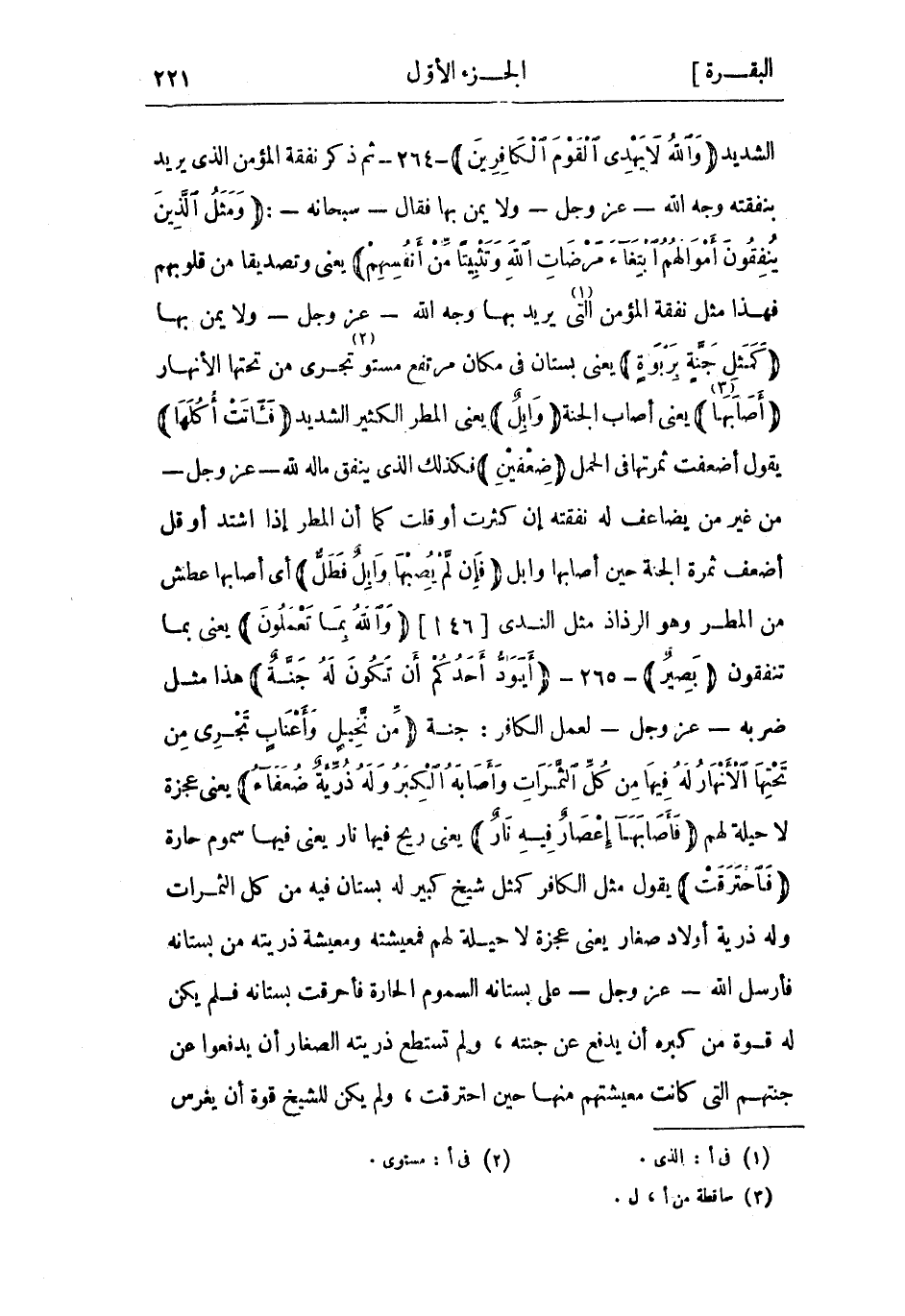 الشديد وَاللَّهُ لا يَهْدِي الْقَوْمَ الْكافِرِينَ- 264- ثُمّ ذكر نفقة الْمُؤْمِن الذي يريد بنفقته وجه اللَّه- عَزَّ وَجَلّ- وَلا يمن بها فَقَالَ- سُبْحَانَهُ-: وَمَثَلُ الَّذِينَ يُنْفِقُونَ أَمْوالَهُمُ ابْتِغاءَ مَرْضاتِ اللَّهِ وَتَثْبِيتاً مِنْ أَنْفُسِهِمْ يعني وتصديقا من قلوبهم فهذا مثل نفقة الْمُؤْمِن التي «1» يريد بها وجه اللَّه- عَزَّ وَجَلّ- وَلا يمن بها كَمَثَلِ جَنَّةٍ بِرَبْوَةٍ يعني بستان فِي مكان مرتفع مستو «2» تجري من تحتها الأنهار أَصابَها «3» يعني أصاب الجنة وابِلٌ يعني المطر الكثير الشديد فَآتَتْ أُكُلَها يَقُولُ أضعفت ثمرتها فِي الحمل ضِعْفَيْنِ فكذلك الذي ينفق ماله للَّه- عَزَّ وَجَلّ- من غير من يضاعف لَهُ نفقته إن كثرت أَوْ قَلّت كَمَا أن المطر إذا اشتد أَوْ قل أضعف ثمرة الجنة حين أصابها وابل فَإِنْ لَمْ يُصِبْها وابِلٌ فَطَلٌّ أَي أصابها عطش من المطر وَهُوَ الرذاذ مثل الندى [46 أ] وَاللَّهُ بِما تَعْمَلُونَ يعني بما تنفقون بَصِيرٌ- 265- أَيَوَدُّ أَحَدُكُمْ أَنْ تَكُونَ لَهُ جَنَّةٌ هَذَا مثل ضربه- عَزَّ وَجَلّ- لعمل الكافر: جنة مِنْ نَخِيلٍ وَأَعْنابٍ تَجْرِي مِنْ تَحْتِهَا الْأَنْهارُ لَهُ فِيها مِنْ كُلِّ الثَّمَراتِ وَأَصابَهُ الْكِبَرُ وَلَهُ ذُرِّيَّةٌ ضُعَفاءُ يعني عجزة لا حيلة لهم فَأَصابَها إِعْصارٌ فِيهِ نارٌ يعني ريح فيها نار يعني فيها سموم حارة فَاحْتَرَقَتْ يَقُولُ مثل الكافر كمثل شيخ كبير لَهُ بستان فِيهِ من كُلّ الثمرات وَلَهُ ذرِّيَّة أولاد صغار يعني عجزة لا حيلة لهم فمعيشته ومعيشة ذريته من بستانه فأرسل اللَّه- عَزَّ وَجَلّ- عَلَى بستانه السموم الحارة فأحرقت بستانه فلم يَكُنْ لَهُ قوة من كبره أن يدفع عن جنته، وَلَم تستطع ذريته الصغار أن يدفعوا عن جنتهم التي كانت معيشتهم منها حين احترقت، وَلَم يكن للشيخ قوة أن يغرس