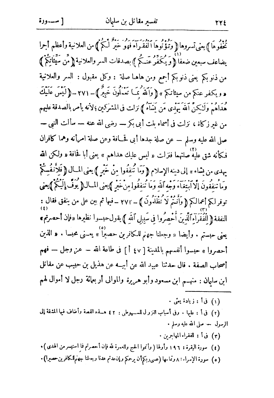 النفقة لِلْفُقَراءِ «3» الَّذِينَ أُحْصِرُوا فِي سَبِيلِ اللَّهِ يَقُولُ حبسوا نظيرها فَإِنْ أُحْصِرْتُمْ «4» يعني حبستم. وأيضا وَجَعَلْنا جَهَنَّمَ لِلْكافِرِينَ حَصِيراً «5» يعني محبسا. الَّذِينَ أُحْصِرُوا حبسوا أنفسهم بالمدينة [47 أ] فِي طاعة اللَّه- عَزَّ وَجَلّ- فهم أصحاب الصفة. قَالَ حدثنا عُبَيْدُ اللَّهِ عن أبيه عن هذيل بن حبيب عن مقاتل ابن سُلَيْمَان: منهم ابْن مَسْعُود وأَبُو هُرَيْرَة والموالي أربعمائة رجل لا أموال لهم