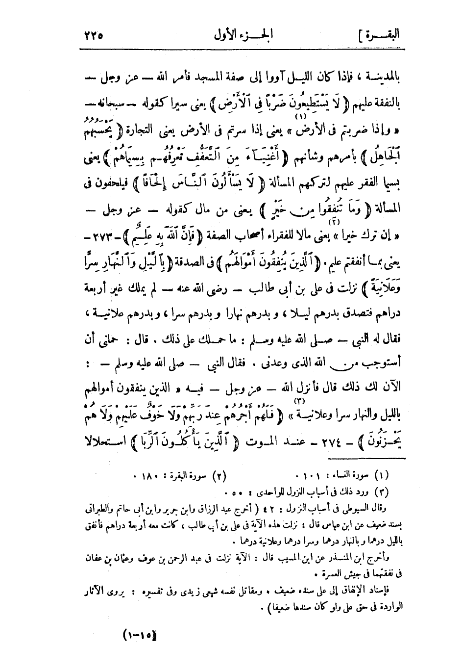 وقال السيوطي فى أسباب النزول: 42 (أخرج عبد الرزاق وابن جرير وابن أبى حاتم والطبراني بسند ضعيف عن ابن عباس قال: نزلت هذه الآية في علي بن أبي طالب، كانت معه أربعة دراهم فأنفق بالليل درهما وبالنهار درهما وسرا درهما وعلانية درهما.