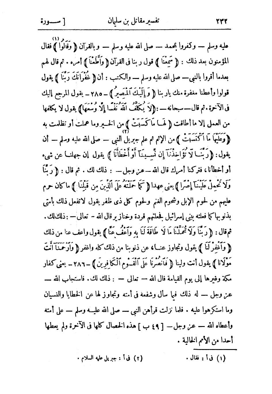 عَلَيْهِ وَسَلَّمَ- وكفروا بمحمد- صَلَّى اللَّهُ عَلَيْهِ وَسَلَّمَ- وبالقرآن وَقالُوا «1» فَقَالَ المؤمنون بعد ذَلِكَ: سَمِعْنا قول ربنا فِي القرآن وَأَطَعْنا أمره. ثم قال لهم بعد ما أقروا بالنَّبِيّ- صَلَّى اللَّهُ عَلَيْهِ وَسَلَّمَ- والكتب: أن غُفْرانَكَ رَبَّنا يَقُولُ قولوا وأعطنا مغفرة منك يا ربنا وَإِلَيْكَ الْمَصِيرُ- 285- يَقُولُ المرجع إليك فى الآخرة. ثُمّ قَالَ- سُبْحَانَهُ-: لا يُكَلِّفُ اللَّهُ نَفْساً إِلَّا وُسْعَها يَقُولُ لا يكلفها من العمل إِلَّا ما أطاقت لَها ما كَسَبَتْ من الخير وما عملت أَوْ تظلمت به وَعَلَيْها مَا اكْتَسَبَتْ من الإثم ثُمّ علم جبريل «2» النَّبِيّ- صَلَّى اللَّهُ عَلَيْهِ وَسَلَّمَ- أن يَقُولُ: رَبَّنا لا تُؤاخِذْنا إِنْ نَسِينا أَوْ أَخْطَأْنا يَقُولُ إن جهلنا عن شيء أَوْ أخطأنا، فتركنا أمرك قَالَ اللَّه- عَزَّ وَجَلّ-: ذَلِكَ لك. ثُمّ قَالَ: رَبَّنا وَلا تَحْمِلْ عَلَيْنا إِصْراً يعني عهدا كَما حَمَلْتَهُ عَلَى الَّذِينَ مِنْ قَبْلِنا ما كان حرم عليهم من لحوم الإبل وشحوم الغنم ولحوم كُلّ ذِي ظفر يَقُولُ لا تفعل ذَلِكَ بأمتي بذنوبها كَمَا فعلته ببني إِسْرَائِيل فجعلتهم قردة وخنازير قَالَ اللَّه- تَعَالَى-: ذَلِكَ لك.