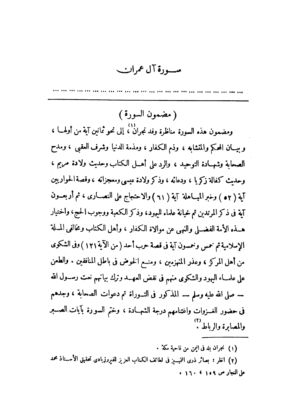 (1) (مضمون السورة) ومضمون هذه السورة مناظرة وفد نجران (بلد فى اليمن من ناحية مكة) ، إلى نحو ثمانين آية من أولها، وبيان المحكم والمتشابه، وذم الكفار، ومذمة الدنيا وشرف العقبى، ومدح الصحابة وشهادة التوحيد، والرد على أهل الكتاب وحديث ولادة مريم، وحديث كفالة زكريا، ودعائه، وذكر ولادة عيسى ومعجزاته، وقصة الحواريين آية (52) وخبر المباهلة آية (61) والاحتجاج على النصارى، ثم أربعون آية فى ذكر المرتدين ثم خيانة علماء اليهود، وذكر الكعبة ووجوب الحج، واختيار هذه الأمة الفضلى والنهى عن موالاة الكفار، وأهل الكتاب ومخالفي الملة الإسلامية ثم خمس وخمسون آية فى قصة حرب أحد (من الآية 121) وفى الشكوى من أهل المركز، وعذر المنهزمين، ومنع الخوض فى باطل المنافقين. والطعن على علماء اليهود والشكوى منهم فى نقض العهد وترك بيانهم نعت رسول الله- صلى الله عليه وسلم- المذكور فى التوراة ثم دعوات الصحابة، وجدهم فى حضور الغزوات واغتنامهم درجة الشهادة، وختم السورة بآيات الصبر والمصابرة والرباط (انظر: بصائر ذوى التمييز فى لطائف الكتاب العزيز للفيروزآبادي تحقيق الأستاذ محمد على النجار ص 159، 160.) .
