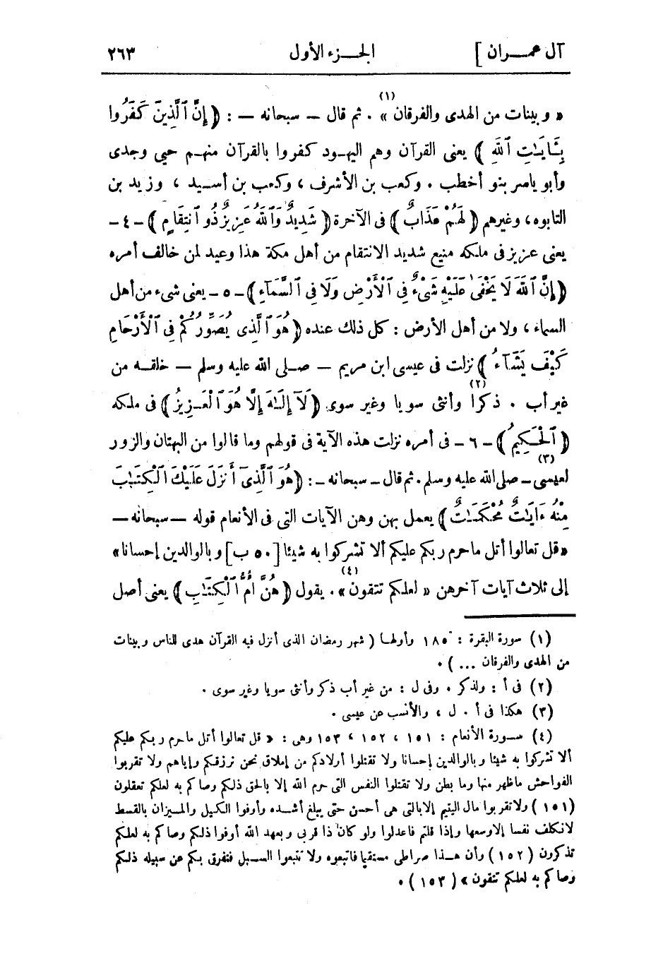 وَبَيِّناتٍ مِنَ الْهُدى وَالْفُرْقانِ «1» . ثُمّ قَالَ- سُبْحَانَهُ-: إِنَّ الَّذِينَ كَفَرُوا بِآياتِ اللَّهِ يعني القرآن وهم اليهود كفروا بالقرآن منهم حيى وجدي وأبو ياسر بنو أخطب. وكعب بن الأشرف، وكعب بن أُسَيْد، وزيد بن التابوه، وَغَيْرُهُمْ لَهُمْ عَذابٌ فِي الآخرة شَدِيدٌ وَاللَّهُ عَزِيزٌ ذُو انْتِقامٍ- 4- يعنى عزيز فى ملكه منيع شديد الانتقام من أهل مكة هَذَا وعيد لمن خالف أمره إِنَّ اللَّهَ لا يَخْفى عَلَيْهِ شَيْءٌ فِي الْأَرْضِ وَلا فِي السَّماءِ- 5- يعني شيء من أَهْل السماء، وَلا من أَهْل الأرض: كُلّ ذَلِكَ عنده هُوَ الَّذِي يُصَوِّرُكُمْ فِي الْأَرْحامِ كَيْفَ يَشاءُ نزلت فِي عِيسَى ابْن مريم- صَلَّى اللَّهُ عَلَيْهِ وَسَلَّمَ- خلقه من غَيْر أب. ذكرا «2» وأنثى سويا وغير سوي لا إِلهَ إِلَّا هُوَ الْعَزِيزُ فِي ملكه الْحَكِيمُ- 6- فِي أمره نزلت هَذِهِ الآية فِي قولهم وما قَالُوا من البهتان والزور لعيسى «3» - صلى الله عليه وسلم. ثم قال- سبحانه-: هُوَ الَّذِي أَنْزَلَ عَلَيْكَ الْكِتابَ مِنْهُ آياتٌ مُحْكَماتٌ يعمل بهن وهن الآيات التي فِي الأنعام قوله- سُبْحَانَهُ- قُلْ تَعالَوْا أَتْلُ مَا حَرَّمَ رَبُّكُمْ عَلَيْكُمْ أَلَّا تُشْرِكُوا بِهِ شَيْئاً وَبِالْوالِدَيْنِ إِحْساناً [50 ب] إلى ثلاث آيات آخرهن لَعَلَّكُمْ تَتَّقُونَ «4» . يَقُولُ هُنَّ أُمُّ الْكِتابِ يعنى أصل