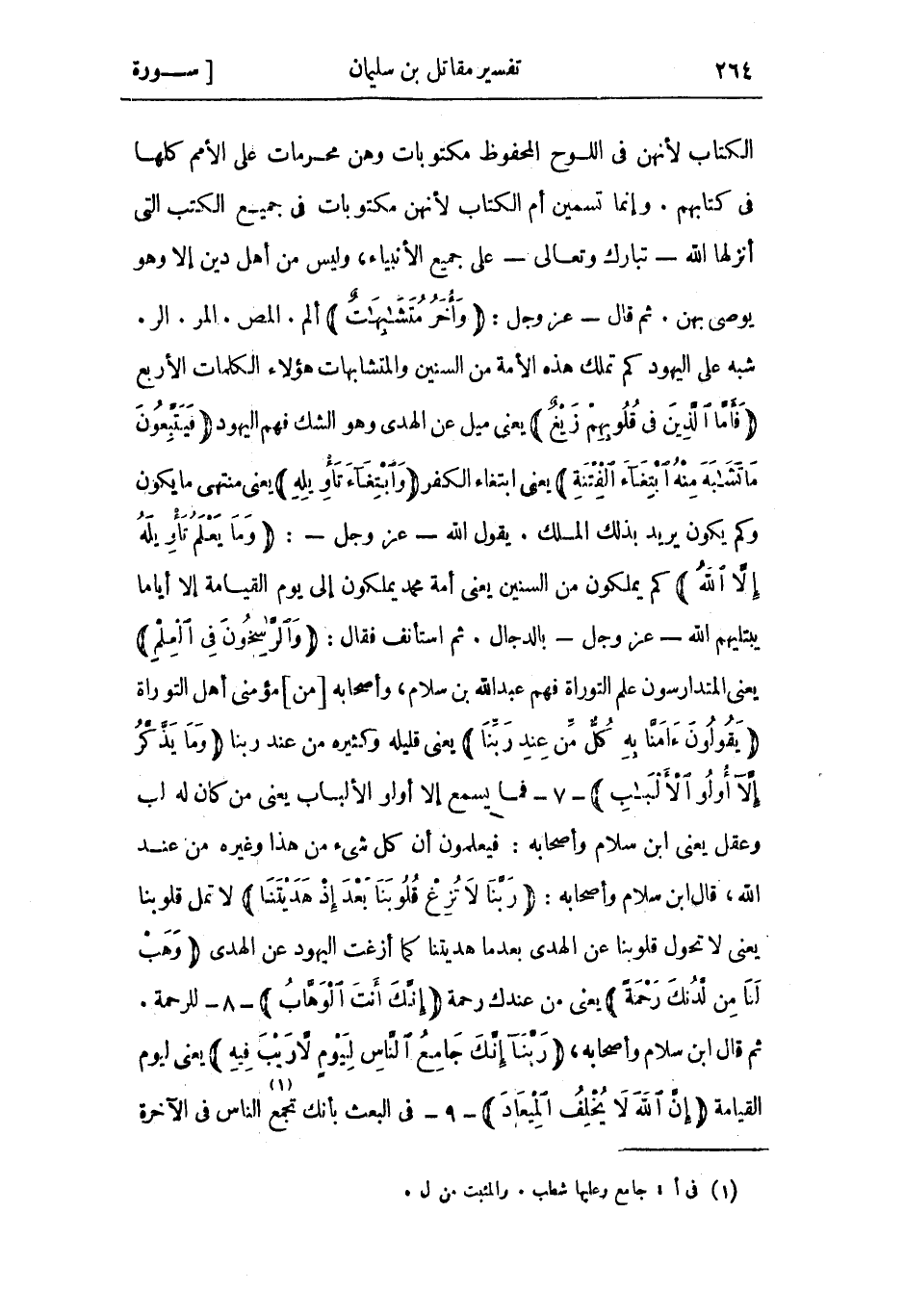 شَبَّه عَلَى اليهود كم تملك هَذِهِ الأمة من السنين والمتشابهات هَؤُلاءِ الكلمات الأربع فَأَمَّا الَّذِينَ فِي قُلُوبِهِمْ زَيْغٌ يعني ميل عن الهدى وَهُوَ الشك فهم اليهود فَيَتَّبِعُونَ مَا تَشابَهَ مِنْهُ ابْتِغاءَ الْفِتْنَةِ يعني ابتغاء الكفر وَابْتِغاءَ تَأْوِيلِهِ يعني منتهى ما يَكُون وكم يَكُون يريد بِذَلِك الملك. يَقُولُ اللَّه- عَزَّ وَجَلّ-: وَما يَعْلَمُ تَأْوِيلَهُ إِلَّا اللَّهُ كم يملكون من السنين يعني أمة محمد يملكون إلى يوم الْقِيَامَة إِلَّا أياما يبتليهم اللَّه- عَزَّ وَجَلّ- بالدجال. ثُمّ استأنف فَقَالَ: وَالرَّاسِخُونَ فِي الْعِلْمِ يعني المتدارسون علم التوراة فهم عَبْد الله بن سلام، وأصحابه [من] مؤمني أَهْل التوراة يَقُولُونَ آمَنَّا بِهِ كُلٌّ مِنْ عِنْدِ رَبِّنا يعني قليله وكثيره من عِنْد ربنا وَما يَذَّكَّرُ إِلَّا أُولُوا الْأَلْبابِ- 7- فما يسمع إلا أولو الألباب يعني من كان لَهُ لب وعقل يعني ابْن سلام وأصحابه: فيعلمون أن كُلّ شيء من هَذَا وغيره من عِنْد اللَّه، قَالَ ابْن سلام وأصحابه: رَبَّنا لا تُزِغْ قُلُوبَنا بَعْدَ إِذْ هَدَيْتَنا لا تمل قلوبنا يعني لا تحول قلوبنا عن الهدى بعد ما هديتنا كَمَا أزغت اليهود عن الهدى وَهَبْ لَنا مِنْ لَدُنْكَ رَحْمَةً يعني من عندك رحمة إِنَّكَ أَنْتَ الْوَهَّابُ- 8- للرحمة.