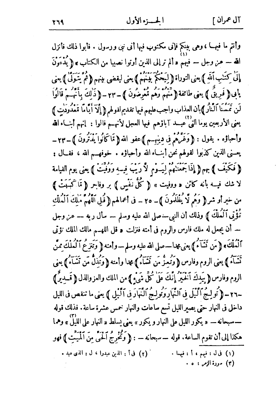 يُدْعَوْنَ إِلى كِتابِ اللَّهِ يعني التوراة لِيَحْكُمَ بَيْنَهُمْ يعني ليقضي بينهم ثُمَّ يَتَوَلَّى يعنى بأبى فَرِيقٌ يعني طائفة مِنْهُمْ وَهُمْ مُعْرِضُونَ- 23- ذلِكَ بِأَنَّهُمْ قالُوا لَنْ تَمَسَّنَا النَّارُ بأن العذاب واجب عليهم فيها تقديم لقولهم إِلَّا أَيَّاماً مَعْدُوداتٍ يعني الأربعين يومًا التي «2» عَبْد آباؤهم فيها العجل لأنهم قَالُوا: إنهم أبناء اللَّه وأحباؤه. يقول: وَغَرَّهُمْ فِي دِينِهِمْ عفو الله ما كانُوا يَفْتَرُونَ- 24- يعني الَّذِين كذبوا لقولهم نَحْنُ أبناء اللَّه وأحباؤه. خوفهم اللَّه، فَقَالَ: