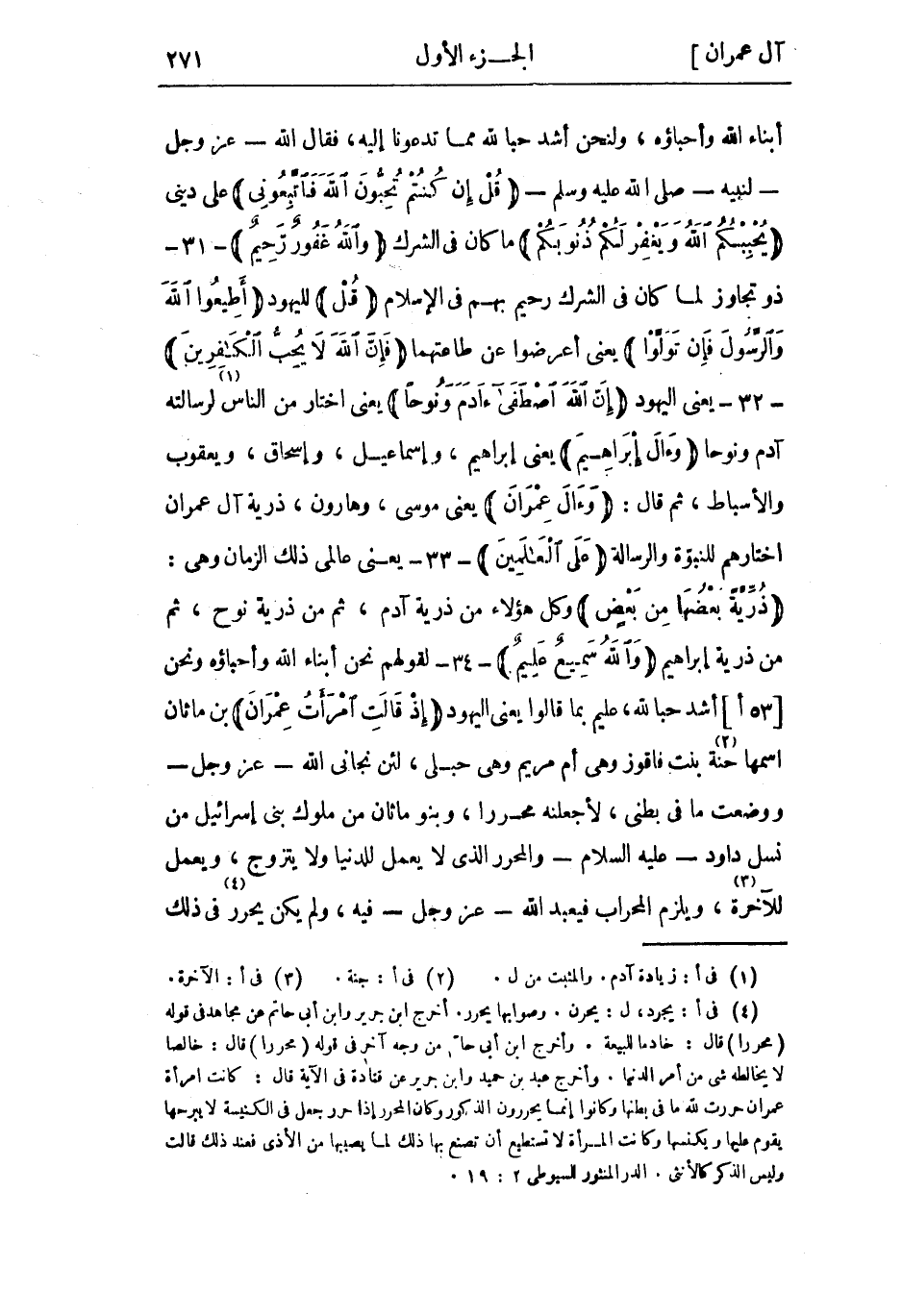 أبناء اللَّه وأحباؤه، ولنحن أشد حبا للَّه مما تدعونا إِلَيْهِ، فَقَالَ اللَّه- عَزَّ وَجَلّ- لنبيه- صلى الله عليه وسلم- قُلْ إِنْ كُنْتُمْ تُحِبُّونَ اللَّهَ فَاتَّبِعُونِي عَلَى ديني يُحْبِبْكُمُ اللَّهُ وَيَغْفِرْ لَكُمْ ذُنُوبَكُمْ ما كان فِي الشرك وَاللَّهُ غَفُورٌ رَحِيمٌ- 31- ذو تجاوز لما كان فِي الشرك رحيم بهم فى الإسلام قُلْ لليهود أَطِيعُوا اللَّهَ وَالرَّسُولَ فَإِنْ تَوَلَّوْا يعني أعرضوا عن طاعتهما فَإِنَّ اللَّهَ لا يُحِبُّ الْكافِرِينَ- 32- يعني اليهود إِنَّ اللَّهَ اصْطَفى آدَمَ وَنُوحاً يعني اختار من الناس «1» لرسالته آدم ونوحا وَآلَ إِبْراهِيمَ يعني إِبْرَاهِيم، وإسماعيل، وإسحاق، ويعقوب والأسباط، ثُمّ قَالَ: وَآلَ عِمْرانَ يعني مُوسَى، وهارون، ذرِّيَّة آل عِمْرَانَ اختارهم للنبوة والرسالة عَلَى الْعالَمِينَ- 33- يعني عالمي ذَلِكَ الزمان وهي: