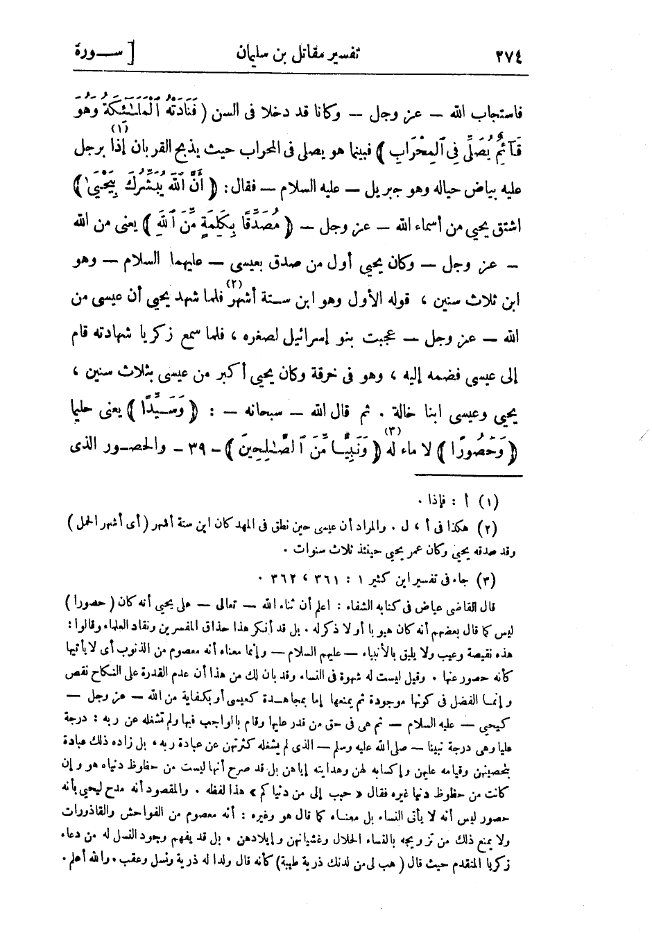 (2) هكذا فى أ، ل. والمراد أن عيسى حين نطق فى المهد كان ابن ستة أشهر (أى أشهر الحمل) وقد صدقه يحيى وكان عمر يحيى حينئذ ثلاث سنوات.