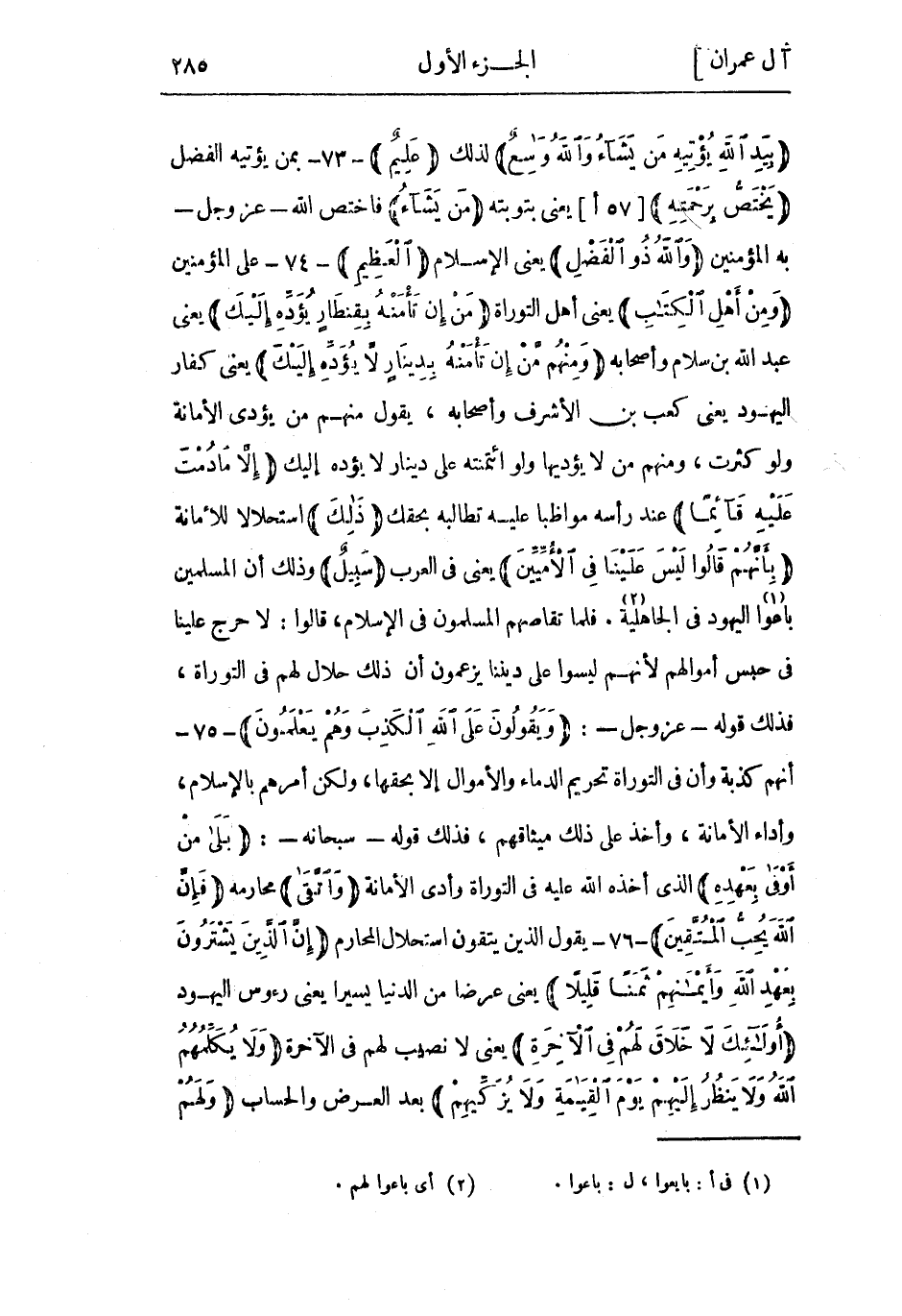 بِيَدِ اللَّهِ يُؤْتِيهِ مَنْ يَشاءُ وَاللَّهُ واسِعٌ لذلك عَلِيمٌ- 73- بمن يؤتيه الْفَضْل يَخْتَصُّ بِرَحْمَتِهِ [57 أ] يعني بتوبته مَنْ يَشاءُ فاختص اللَّه- عَزَّ وَجَلّ- به الْمُؤْمِنِين وَاللَّهُ ذُو الْفَضْلِ يعني الْإِسْلام الْعَظِيمِ- 74- عَلَى الْمُؤْمِنِين وَمِنْ أَهْلِ الْكِتابِ يعني أَهْل التوراة مَنْ إِنْ تَأْمَنْهُ بِقِنْطارٍ يُؤَدِّهِ إِلَيْكَ يعني عَبْد اللَّه بن سلام وأصحابه وَمِنْهُمْ مَنْ إِنْ تَأْمَنْهُ بِدِينارٍ لا يُؤَدِّهِ إِلَيْكَ