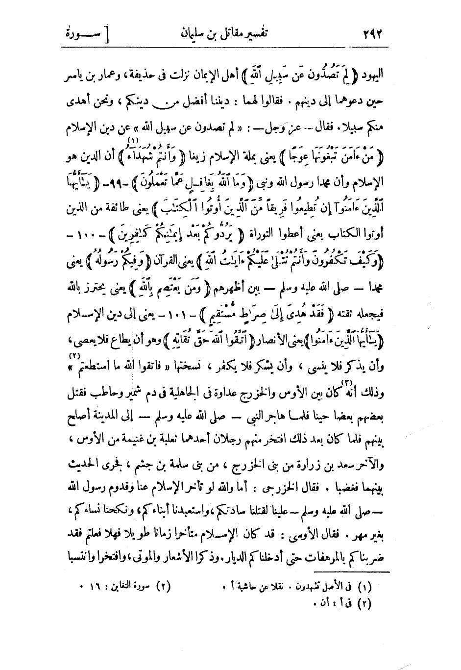 اليهود لِمَ تَصُدُّونَ عَنْ سَبِيلِ اللَّهِ أهل الإيمان نزلت في حذيفة، وعمار بن ياسر حين دعوهما إلى دينهم. فقالوا لهما: ديننا أفضل من دينكم، ونحن أهدى منكم سبيلا. فقال- عز وجل-: «لِمَ تَصُدُّونَ عَنْ سَبِيلِ اللَّهِ» عن دين الْإِسْلام مَنْ آمَنَ تَبْغُونَها عِوَجاً يعني بملة الْإِسْلام زيغا وَأَنْتُمْ شُهَداءُ «1» أن الدّين هُوَ الْإِسْلام وأن محمدا رَسُول اللَّهِ ونبى وَمَا اللَّهُ بِغافِلٍ عَمَّا تَعْمَلُونَ- 99- يا أَيُّهَا الَّذِينَ آمَنُوا إِنْ تُطِيعُوا فَرِيقاً مِنَ الَّذِينَ أُوتُوا الْكِتابَ يعني طائفة من الَّذِين أوتوا الكتاب يعني أعطوا التوراة يَرُدُّوكُمْ بَعْدَ إِيمانِكُمْ كافِرِينَ- 100- وَكَيْفَ تَكْفُرُونَ وَأَنْتُمْ تُتْلى عَلَيْكُمْ آياتُ اللَّهِ يعني القرآن وَفِيكُمْ رَسُولُهُ يعني محمدا- صَلَّى اللَّهُ عَلَيْهِ وَسَلَّمَ- بين أظهرهم وَمَنْ يَعْتَصِمْ بِاللَّهِ يعنى يحترز بِاللَّه فيجعله ثقته فَقَدْ هُدِيَ إِلى صِراطٍ مُسْتَقِيمٍ- 101- يعنى إلى دين الإسلام يا أَيُّهَا الَّذِينَ آمَنُوا يعنى الأنصار اتَّقُوا اللَّهَ حَقَّ تُقاتِهِ وَهُوَ أن يطاع فلا يعصى، وأن يذكر فلا ينسى، وأن يشكر فلا يكفر، نسختها «فَاتَّقُوا اللَّهَ مَا اسْتَطَعْتُمْ» «2» وذلك أَنَّهُ «3» كان بين الأوس والخزرج عداوة فِي الْجَاهِلِيَّة فِي دم شمير وحاطب فقتل بعضهم بعضا حينا فَلَمَّا هاجر النَّبِيّ- صَلَّى اللَّهُ عَلَيْهِ وَسَلَّمَ- إلى المدينة أصلح بينهم فلما كان بعد ذلك افتخر منهم رجلان أَحَدهمَا ثَعْلَبَة بن غنيمة من الأوس، والآخر سعد بن زُرَارَة من بني الخزرج، من بني سَلَمَة بن جشم، فجرى الحديث بينهما فغضبا. فقال الخزرجي: أما واللَّه لو تأخر الْإِسْلام عنا وقدوم رَسُول اللَّهِ- صَلَّى اللَّهُ عَلَيْهِ وَسَلَّمَ- علينا لقتلنا سادتكم، واستعبدنا أبناءكم، ونكحنا نساءكم، بغير مهر.