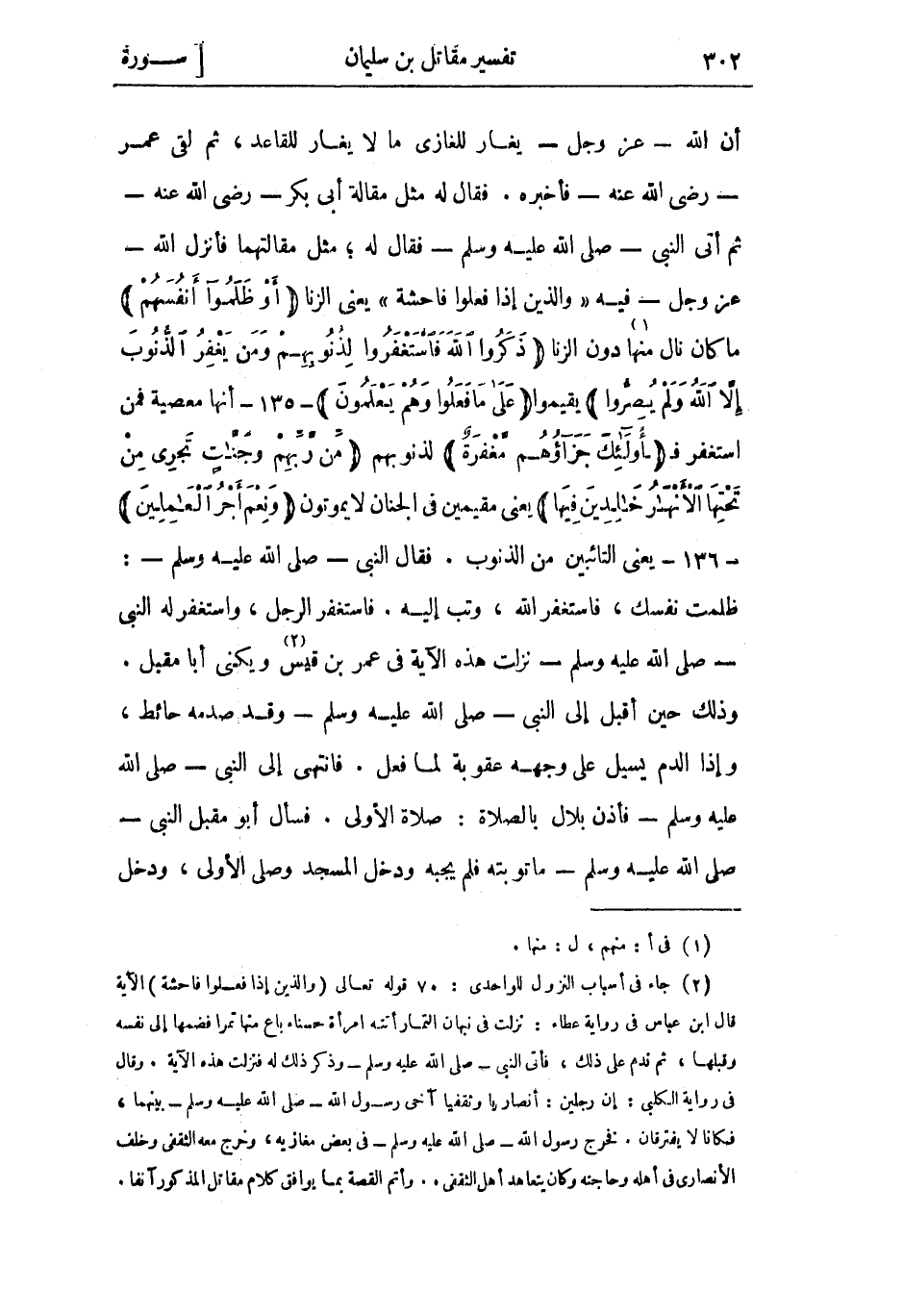 أن اللَّه- عَزَّ وَجَلّ- يغار للغازي ما لا يغار للقاعد، ثُمّ لقي عُمَر- رَضِيَ اللَّه عَنْهُ- فَأَخْبَرَه. فَقَالَ لَهُ مثل مقالة أَبِي بَكْر- رَضِيَ اللَّه عَنْهُ- ثُمّ أتى النبي- صلى الله عليه وسلم- فقال له، مثل مقالتهما فأنزل اللَّه- عَزَّ وَجَلّ- فِيهِ «وَالَّذِينَ إِذا فَعَلُوا فاحِشَةً» يعنى الزنا أَوْ ظَلَمُوا أَنْفُسَهُمْ ما كان نال منها «1» دون الزنا ذَكَرُوا اللَّهَ فَاسْتَغْفَرُوا لِذُنُوبِهِمْ وَمَنْ يَغْفِرُ الذُّنُوبَ إِلَّا اللَّهُ وَلَمْ يُصِرُّوا يقيموا عَلى ما فَعَلُوا وَهُمْ يَعْلَمُونَ- 135- أنها معصية فَمنْ استغفر ف أُولئِكَ جَزاؤُهُمْ مَغْفِرَةٌ لذنوبهم مِنْ رَبِّهِمْ وَجَنَّاتٌ تَجْرِي مِنْ تَحْتِهَا الْأَنْهارُ خالِدِينَ فِيها يعني مقيمين فِي الجنان لا يموتون وَنِعْمَ أَجْرُ الْعامِلِينَ- 136- يعني التائبين من الذنوب. فَقَالَ النَّبِيّ- صَلَّى اللَّهُ عَلَيْهِ وَسَلَّمَ-: