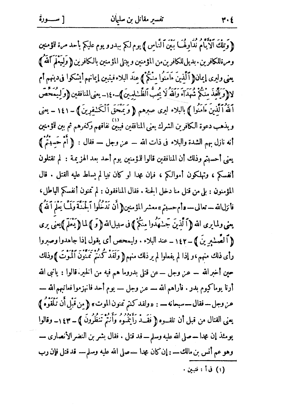 وَتِلْكَ الْأَيَّامُ نُداوِلُها بَيْنَ النَّاسِ يوم لَكُمْ ببدر ويوم عليكم بأحد مرة للمؤمنين ومرة للكافرين. بديل للكافرين من الْمُؤْمِنِين ويبتلى الْمُؤْمِنِين بالكافرين وَلِيَعْلَمَ اللَّهُ يعني وليرى إيمان الَّذِينَ آمَنُوا منكم عِنْد البلاء فيتبين إيمانهم أيشكوا فِي دينهم أم لا وَيَتَّخِذَ مِنْكُمْ شُهَداءَ وَاللَّهُ لا يُحِبُّ الظَّالِمِينَ- 140- يعنى المنافقين وَلِيُمَحِّصَ اللَّهُ الَّذِينَ آمَنُوا بالبلاء ليرى صبرهم وَيَمْحَقَ الْكافِرِينَ- 141- يعني ويذهب دعوة الكافرين الشرك يعني المنافقين فيبين «1» نفاقهم وكفرهم ثُمّ بين للمؤمنين أَنَّهُ نازل بهم الشدة والبلاء فِي ذات اللَّه- عَزَّ وَجَلّ- فَقَالَ: أَمْ حَسِبْتُمْ يعني أحسبتم وذلك أن المنافقين قَالُوا للمؤمنين يوم أحد بعد الهزيمة: لم تقتلون أنفسكم، وتهلكون أموالكم، فَإِن محمدا لو كان نبيا لَمْ يسلط عَلَيْه القتل. قَالَ المؤمنون: بلى من قُتِل مِنَّا دخل الجنة. فَقَالَ المنافقون: لَمْ تمنون أنفسكم الباطل، فأنزل اللَّه- تَعَالَى- أَمْ حَسِبْتُمْ مَعْشَر الْمُؤْمِنِين أَنْ تَدْخُلُوا الْجَنَّةَ وَلَمَّا يَعْلَمِ اللَّهُ يعني ولما يرى اللَّه الَّذِينَ جاهَدُوا مِنْكُمْ فى سبيل الله وَلما يَعْلَمِ يعني يرى الصَّابِرِينَ- 142- عِنْد البلاء. وليمحص أَيّ يَقُولُ إذا جاهدوا وصبروا رَأَى ذَلِكَ منهم، وإذا لَمْ يفعلوا لَمْ ير ذَلِكَ منهم وَلَقَدْ كُنْتُمْ تَمَنَّوْنَ الْمَوْتَ وذلك حين أخبر اللَّه- عَزَّ وَجَلّ- عن قتلى بدر وما هُمْ فِيهِ من الخير. قَالُوا: يا نَبِيّ اللَّه أرنا يومًا كيوم بدر. فأراهم اللَّه- عَزَّ وَجَلّ- يوم أحد فانهزموا فعاتبهم اللَّه- عَزَّ وَجَلّ- فَقَالَ- سُبْحَانَهُ-: وَلَقَدْ كُنْتُمْ تَمَنَّوْنَ الْمَوْتَ مِنْ قَبْلِ أَنْ تَلْقَوْهُ يعني القتال من قبل أن تلقوه فَقَدْ رَأَيْتُمُوهُ وَأَنْتُمْ تَنْظُرُونَ- 143- وقالوا يومئذ إن محمدا- صَلَّى اللَّهُ عَلَيْهِ وَسَلَّمَ- قَدْ قُتِل. فَقَالَ بشر بن النَّضْر الْأَنْصَارِيّ- وَهُوَ عم أنس بن مَالِك-: إن كان محمدا- صَلَّى اللَّهُ عَلَيْهِ وَسَلَّمَ- قَدْ قتل فإن رب