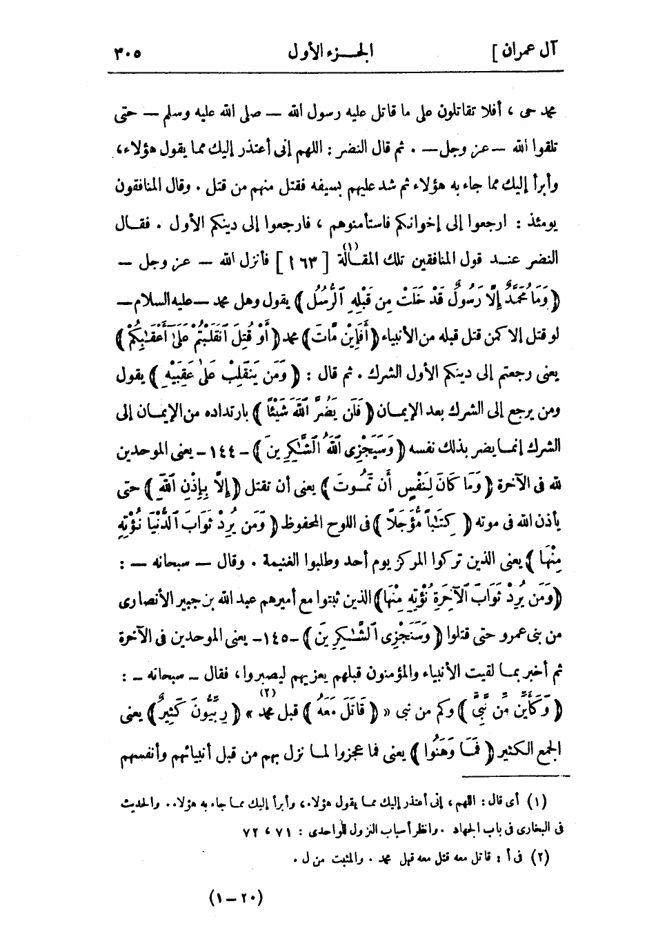 محمد حي، أفلا تقاتلون عَلَى ما قاتل عَلَيْه رَسُول اللَّهِ- صَلَّى اللَّهُ عَلَيْهِ وَسَلَّمَ- حَتَّى تلقوا اللَّه- عَزَّ وَجَلّ-. ثُمّ قَالَ النَّضْر: اللَّهُمَّ إني أعتذر إليك مما يَقُولُ هَؤُلاءِ، وأبرأ إليك مما جاء به هَؤُلاءِ ثُمّ شد عليهم بسيفه فقتل منهم من قتل. وقَالَ المنافقون يومئذ: ارجعوا إلى إخوانكم فاستأمنوهم، فارجعوا إلى دينكم الأول. فَقَالَ النَّضْر عند قول المنافقين تلك المقالة «1» [63 أ] فأنزل اللَّه- عَزَّ وَجَلّ- وَما مُحَمَّدٌ إِلَّا رَسُولٌ قَدْ خَلَتْ مِنْ قَبْلِهِ الرُّسُلُ يَقُولُ وهل محمد- عَلَيْه السَّلام- لو قُتِل إِلَّا كَمَن قُتِل قبله من الْأَنْبِيَاء أَفَإِنْ ماتَ محمد أَوْ قُتِلَ انْقَلَبْتُمْ عَلى أَعْقابِكُمْ يعني رجعتم إلى دينكم الأول الشرك. ثُمّ قال: وَمَنْ يَنْقَلِبْ عَلى عَقِبَيْهِ يَقُولُ ومن يرجع إِلَى الشرك بعد الْإِيمَان فَلَنْ يَضُرَّ اللَّهَ شَيْئاً بارتداده من الْإِيمَان إلى الشرك إِنَّمَا يضر بذلك نفسه وَسَيَجْزِي اللَّهُ الشَّاكِرِينَ- 144- يعني الموحدين للَّه فِي الآخرة وَما كانَ لِنَفْسٍ أَنْ تَمُوتَ يعنى أن تقتل إِلَّا بِإِذْنِ اللَّهِ حتى يأذن الله فى موته كِتاباً مُؤَجَّلًا فِي اللوح المحفوظ وَمَنْ يُرِدْ ثَوابَ الدُّنْيا نُؤْتِهِ مِنْها يعني الَّذِين تركوا المركز يوم أحد وطلبوا الغنيمة. وقَالَ- سُبْحَانَهُ-: