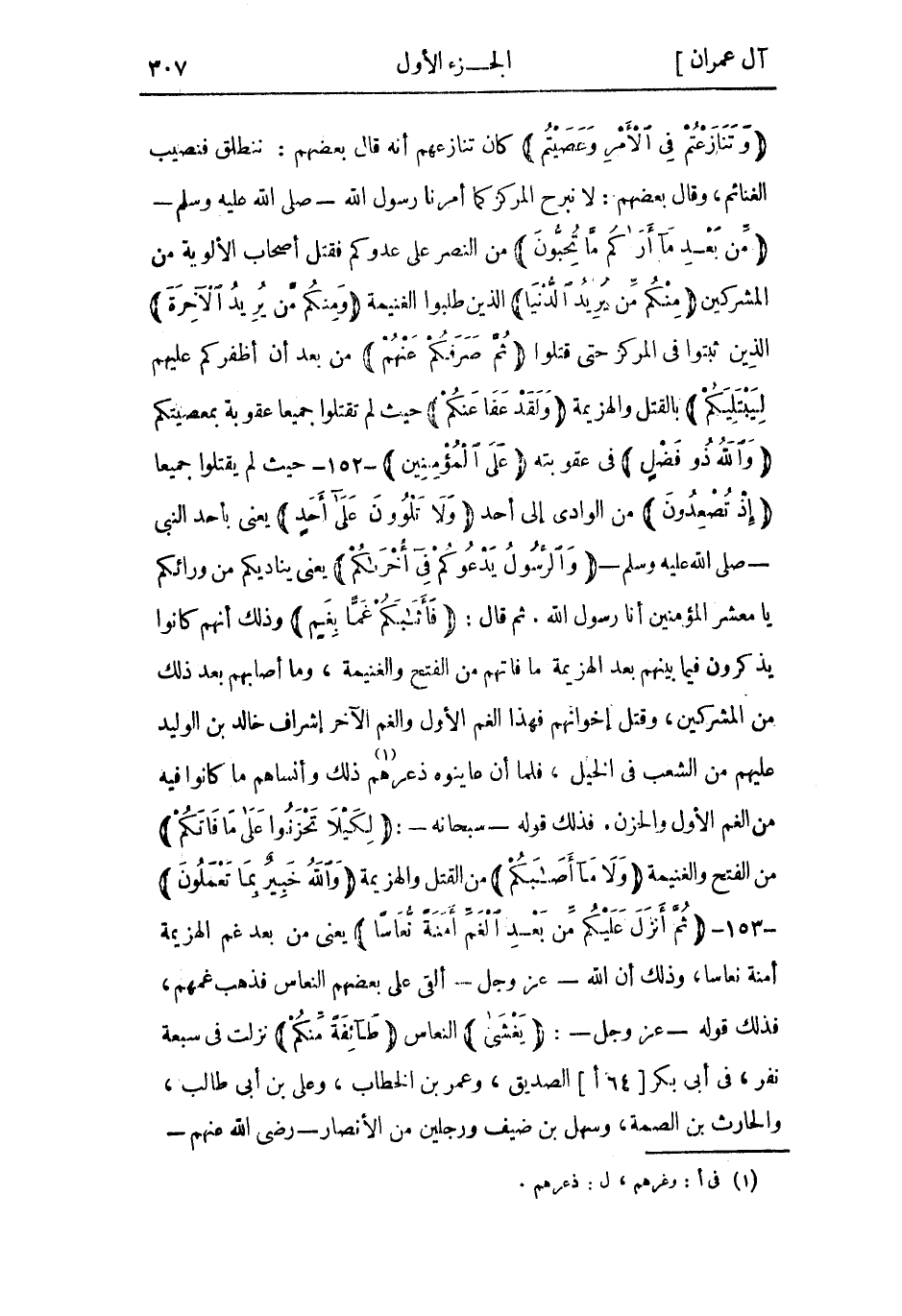 وَتَنازَعْتُمْ فِي الْأَمْرِ وَعَصَيْتُمْ كان تنازعهم أنه قال بعضهم: ننطلق فتصيب الغنائم، وقَالَ بعضهم: لا نبرح المركز كَمَا أمرنا رَسُول اللَّهِ- صَلَّى اللَّهُ عَلَيْهِ وَسَلَّمَ- مِنْ بَعْدِ ما أَراكُمْ ما تُحِبُّونَ من النصر عَلَى عدوكم فقتل أصحاب الألوية من المشركين مِنْكُمْ مَنْ يُرِيدُ الدُّنْيا الَّذِين طلبوا الغنيمة وَمِنْكُمْ مَنْ يُرِيدُ الْآخِرَةَ الَّذِين ثبتوا فِي المركز حَتَّى قتلوا ثُمَّ صَرَفَكُمْ عَنْهُمْ من بعد أن أظفركم عليهم لِيَبْتَلِيَكُمْ بالقتل والهزيمة وَلَقَدْ عَفا عَنْكُمْ حيث لَمْ تقتلوا جميعًا عقوبة بمعصيتكم وَاللَّهُ ذُو فَضْلٍ فِي عقوبته عَلَى الْمُؤْمِنِينَ- 152- حيث لَمْ يقتلوا جميعًا إِذْ تُصْعِدُونَ من الوادي إلى أحد وَلا تَلْوُونَ عَلى أَحَدٍ يعني بأحد النَّبِيّ- صَلَّى اللَّهُ عَلَيْهِ وَسَلَّمَ- وَالرَّسُولُ يَدْعُوكُمْ فِي أُخْراكُمْ يعني يناديكم من ورائكم يا مَعْشَر الْمُؤْمِنِين أَنَا رَسُول اللَّه. ثُمّ قَالَ: فَأَثابَكُمْ غَمًّا بِغَمٍّ وذلك أنهم كانوا يذكرون فيما بينهم بعد الهزيمة ما فاتهم من الفتح والغنيمة، وما أصابهم بعد ذَلِكَ من المشركين، وقتل إخوانهم فهذا الغم الأول والغم الآخر إشراف خَالِد بن الْوَلِيد عليهم من الشعب فِي الخيل، فَلَمَّا أن عاينوه ذعرهم «1» ذَلِكَ وأنساهم ما كانوا فِيهِ من الغم الأول والحزن. فذلك قوله- سُبْحَانَهُ-: لِكَيْلا تَحْزَنُوا عَلى مَا فاتَكُمْ من الفتح والغنيمة وَلا ما أَصابَكُمْ من القتل والهزيمة وَاللَّهُ خَبِيرٌ بِما تَعْمَلُونَ- 153- ثُمَّ أَنْزَلَ عَلَيْكُمْ مِنْ بَعْدِ الْغَمِّ أَمَنَةً نُعاساً يعني من بعد غم الهزيمة أمنة نعاسا، وذلك أن اللَّه- عَزَّ وَجَلّ- ألقى عَلَى بعضهم النعاس فذهب غمهم، فذلك قوله- عَزَّ وَجَلّ-: يَغْشى النعاس طائِفَةً مِنْكُمْ نزلت فِي سبعة نفر، فى أبى بكر [64 أ] الصِّدِّيق، وعمر بن الخَطَّاب، وعلي بن أَبِي طَالِب، والحارث بن الصمة، وسهل بن ضيف ورجلين من الأنصار- رضى الله عنهم-