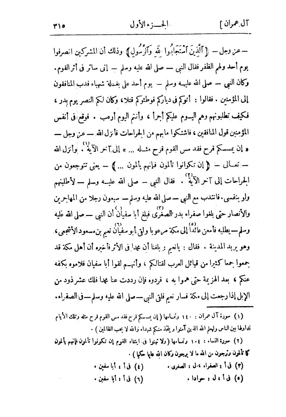 وكان النَّبِيّ- صَلَّى اللَّهُ عَلَيْهِ وَسَلَّمَ- يوم أحد عَلَى بغلة شهباء فدب المنافقون إلى الْمُؤْمِنِين. فقالوا: أتوكم فِي دياركم فوطئوكم قتلا، وكان لَكُم النصر يوم بدر، فكيف تطلبونهم وهم اليوم عليكم أجرأ، وأنتم اليوم أرعب. فوقع فِي أنفس الْمُؤْمِنِين قول المنافقين، فاشتكوا ما بهم من الجراحات فأنزل اللَّه- عَزَّ وَجَلّ- إِنْ يَمْسَسْكُمْ قَرْحٌ فَقَدْ مَسَّ الْقَوْمَ قَرْحٌ مِثْلُهُ ... إلى آخر الآية «1» . وأنزل اللَّه- تَعَالَى- إِنْ تَكُونُوا تَأْلَمُونَ فَإِنَّهُمْ يَأْلَمُونَ ... - يعني تتوجعون من الجراحات إلى آخر الآية «2» . فَقَالَ النَّبِيّ- صَلَّى اللَّهُ عَلَيْهِ وَسَلَّمَ- لأطلبنهم ولو بنفسي. فانتدب مَعَ النَّبِيّ- صَلَّى اللَّهُ عَلَيْهِ وَسَلَّمَ- سبعون رَجُلا من المهاجرين والأنصار حَتَّى بلغوا صفراء بدر الصغرى «3» فبلغ أبا سُفْيَان «4» أن النَّبِيّ- صَلَّى اللَّهُ عَلَيْهِ وَسَلَّمَ- يطلبه فأمعن عائدا «5» إلى مكة مرعوبا ولقي أَبُو سُفْيَان «6» نُعَيْم بن مَسْعُود الأشْجَعيّ، وَهُوَ يريد المدينة. فَقَالَ: يا نُعَيْم: بلغنا أن محمدا فِي الأثر فَأَخْبَرَه أن أَهْل مكة قَدْ جمعوا جمعا كثيرًا من قبائل العرب لقتالكم، وأنهم لقوا أبا سُفْيَان فلاموه بكفه عنكم، بعد الهزيمة حَتَّى هموا به، فردوه فَإِن رددت عنا محمدا فلك عشر ذود من الإبل إذا رجعت إلى مكة فسار نُعَيْم فلقي النَّبِيّ- صَلَّى اللَّهُ عَلَيْهِ وَسَلَّمَ- فى الصفراء.