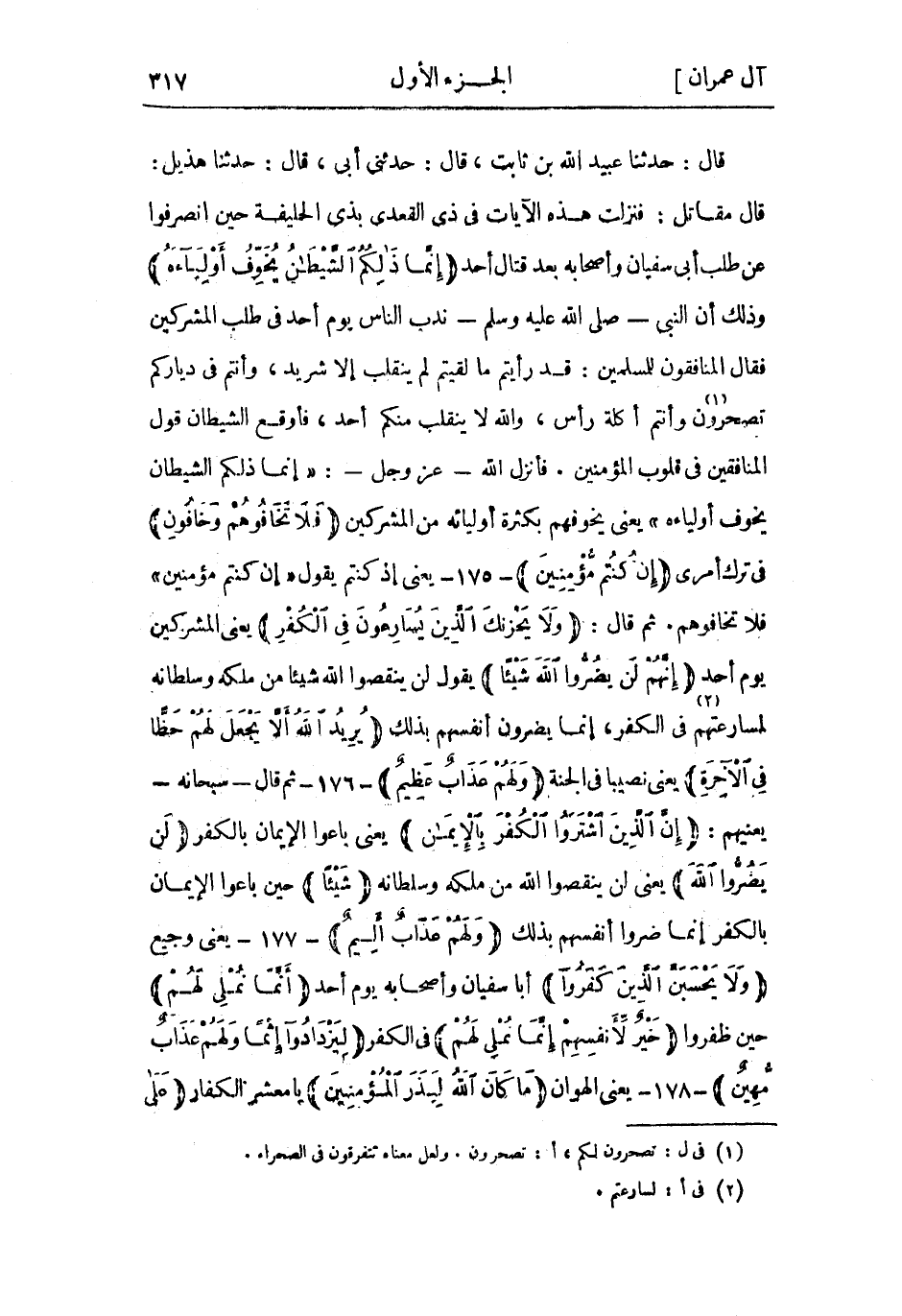 قَالَ مُقَاتِلٌ: فنزلت هَذِهِ الآيات فِي ذِي القعدة بذي الحليفة حين انصرفوا عن طلب أَبِي سُفْيَان وأصحابه بعد قتال أحد إِنَّما ذلِكُمُ الشَّيْطانُ يُخَوِّفُ أَوْلِياءَهُ وذلك أن النبي- صلى الله عليه وسلم- ندب الناس يوم أحد فِي طلب المشركين فَقَالَ المنافقون للمسلمين: قَدْ رأيتم ما لقيتم لَمْ ينقلب إِلَّا شريد، وأنتم فِي دياركم تصحرون «1» وأنتم أكلة رأس، واللَّه لا ينقلب منكم أحد، فأوقع الشَّيْطَان قول المنافقين فِي قلوب الْمُؤْمِنِين. فأنزل اللَّه- عَزَّ وَجَلّ-: إِنَّما ذلِكُمُ الشَّيْطانُ يُخَوِّفُ أَوْلِياءَهُ يعني يخوفهم بكثرة أوليائه من المشركين فَلا تَخافُوهُمْ وَخافُونِ فى ترك أمرى إِنْ كُنْتُمْ مُؤْمِنِينَ- 175- يعني إذ كنتم يَقُولُ إِنْ كُنْتُمْ مُؤْمِنِينَ فلا تخافوهم. ثُمّ قَالَ: وَلا يَحْزُنْكَ الَّذِينَ يُسارِعُونَ فِي الْكُفْرِ يعني المشركين يوم أحد إِنَّهُمْ لَنْ يَضُرُّوا اللَّهَ شَيْئاً يقول لن ينقصوا اللَّه شيئًا من ملكه وسلطانه لمسارعتهم «2» فِي الكفر، إنما يضرون أنفسهم بِذَلِك يُرِيدُ اللَّهُ أَلَّا يَجْعَلَ لَهُمْ حَظًّا فِي الْآخِرَةِ يعني نصيبا فِي الجنة وَلَهُمْ عَذابٌ عَظِيمٌ- 176- ثُمّ قَالَ- سُبْحَانَهُ- يعنيهم: إِنَّ الَّذِينَ اشْتَرَوُا الْكُفْرَ بِالْإِيْمانِ يعني باعوا الْإِيمَان بالكفر لَنْ يَضُرُّوا اللَّهَ يعني لن ينقصوا اللَّه من ملكه وسلطانه شَيْئاً حين باعوا الْإِيمَان بالكفر إِنَّمَا ضروا أنفسهم بذلك وَلَهُمْ عَذابٌ أَلِيمٌ- 177- يعنى وجيع وَلا يَحْسَبَنَّ الَّذِينَ كَفَرُوا أبا سُفْيَان وأصحابه يوم أحد أَنَّما نُمْلِي لَهُمْ حين ظفروا خَيْرٌ لِأَنْفُسِهِمْ إِنَّما نُمْلِي لَهُمْ فِي الكفر لِيَزْدادُوا إِثْماً وَلَهُمْ عَذابٌ مُهِينٌ- 178- يعني الهوان مَا كانَ اللَّهُ لِيَذَرَ الْمُؤْمِنِينَ يا مَعْشَر الكفار عَلى مَا أَنْتُمْ عَلَيْهِ