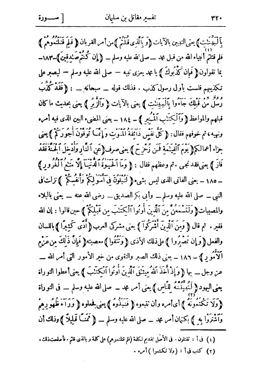 قَدْ جاءَكُمْ رُسُلٌ مِنْ قَبْلِي بِالْبَيِّناتِ يعني التبيين بالآيات وَبِالَّذِي قُلْتُمْ من أمر القربان فَلِمَ قَتَلْتُمُوهُمْ فلم قتلتم «1» أنبياء اللَّه من قبل محمد- صَلَّى اللَّهُ عَلَيْهِ وَسَلَّمَ- إِنْ كُنْتُمْ صادِقِينَ- 183- بما تقولون فَإِنْ كَذَّبُوكَ يا محمد يعزي نبيه- صلى الله عليه وسلم- ليصبر على تكذيبهم فلست بأول رسول كذب. فذلك قوله- سبحانه-: فَقَدْ كُذِّبَ رُسُلٌ مِنْ قَبْلِكَ جاؤُ بِالْبَيِّناتِ يعني بالآيات وَالزُّبُرِ يعني بحديث ما كان قبلهم والمواعظ وَالْكِتابِ الْمُنِيرِ- 184- يعني المضيء البين الذي فيه أمره ونهيه، ثُمّ خوفهم فَقَالَ: كُلُّ نَفْسٍ ذائِقَةُ الْمَوْتِ وَإِنَّما تُوَفَّوْنَ أُجُورَكُمْ يعني جزاء أعمالكم يَوْمَ الْقِيامَةِ فَمَنْ زُحْزِحَ يعني صرف عَنِ النَّارِ وَأُدْخِلَ الْجَنَّةَ فَقَدْ فازَ يعني فقد نجى. ثُمّ وعظهم فَقَالَ: وَمَا الْحَياةُ الدُّنْيا إِلَّا مَتاعُ الْغُرُورِ- 185- يعني الفاني الَّذِي لَيْسَ بشيء لَتُبْلَوُنَّ فِي أَمْوالِكُمْ وَأَنْفُسِكُمْ نزلت في النبي- صلى الله عليه وسلم- وأبي بَكْر الصِّدِّيق- رَضِيَ اللَّه عَنْهُ- يعني بالبلاء والمصيبات وَلَتَسْمَعُنَّ مِنَ الَّذِينَ أُوتُوا الْكِتابَ مِنْ قَبْلِكُمْ حين قَالُوا: إن اللَّه فقير. ثُمّ قَالَ وَمِنَ الَّذِينَ أَشْرَكُوا يعني مشركي العرب أَذىً كَثِيراً باللسان والفعل وَإِنْ تَصْبِرُوا عَلَى ذَلِكَ الأذى وَتَتَّقُوا معصيته فَإِنَّ ذلِكَ مِنْ عَزْمِ الْأُمُورِ- 186- يعني ذَلِكَ الصَّبْر والتقوى من خير الأمور التي أمر اللَّه- عَزَّ وَجَلّ- بها وَإِذْ أَخَذَ اللَّهُ مِيثاقَ الَّذِينَ أُوتُوا الْكِتابَ يعنى أعطوا التوراة وَلا تَكْتُمُونَهُ «2» أَي أمره وأن تتبعوه فَنَبَذُوهُ يعني فجعلوه وَراءَ ظُهُورِهِمْ وَاشْتَرَوْا بِهِ بكتمان أمر محمد- صَلَّى اللَّهُ عَلَيْهِ وَسَلَّمَ- ثَمَناً قَلِيلًا وذلك أن
