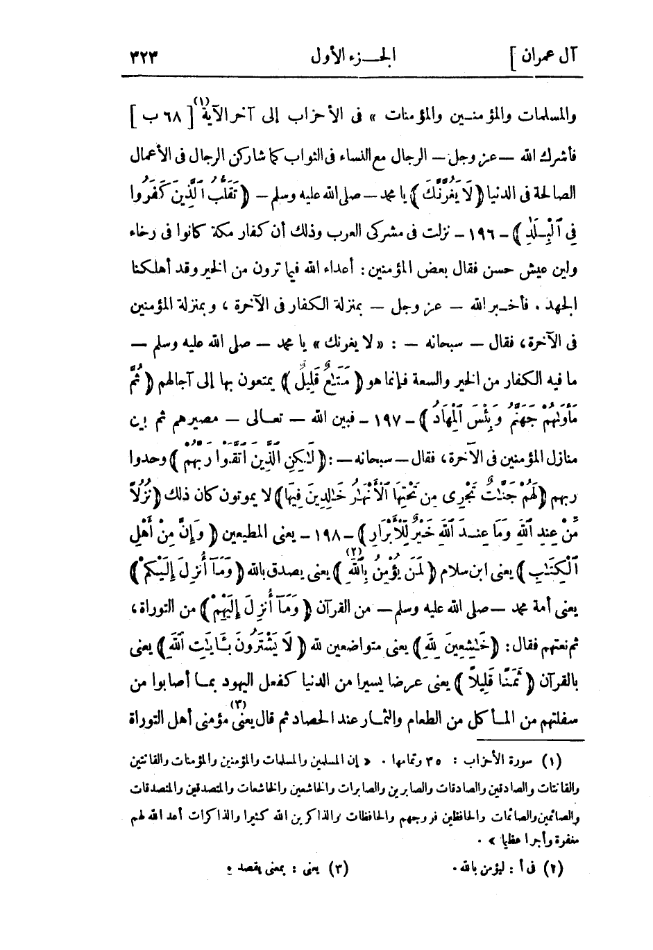 إِنَّ الْمُسْلِمِينَ وَالْمُسْلِماتِ وَالْمُؤْمِنِينَ وَالْمُؤْمِناتِ فى الأحزاب إلى آخر الآية «1» [68 ب] فأشرك اللَّه- عَزَّ وَجَلّ- الرجال مَعَ النّساء فِي الثواب كَمَا شاركن الرجال فِي الأعمال الصالحة فى الدنيا لا يَغُرَّنَّكَ يا محمد- صَلَّى اللَّهُ عَلَيْهِ وسلم- تَقَلُّبُ الَّذِينَ كَفَرُوا فِي الْبِلادِ- 196- نزلت فِي مشركي العرب وذلك أن كفار مكة كانوا فِي رخاء ولين عيش حسن فَقَالَ بعض الْمُؤْمِنِين: أعداء اللَّه فيما ترون من الخير وَقَدْ أهلكنا الجهد. فأخبر اللَّه- عَزَّ وَجَلّ- بمنزلة الكفار فِي الآخرة، وبمنزلة الْمُؤْمِنِين فِي الآخرة، فَقَالَ- سُبْحَانَهُ-: لا يَغُرَّنَّكَ يا محمد- صَلَّى اللَّهُ عَلَيْهِ وَسَلَّمَ- ما فِيهِ الكفار من الخير والسعة فَإِنَّمَا هُوَ مَتاعٌ قَلِيلٌ يمتعون بها إلى آجالهم ثُمَّ مَأْواهُمْ جَهَنَّمُ وَبِئْسَ الْمِهادُ- 197- فبين الله- تعالى- مصيرهم ثُمّ بين منازل الْمُؤْمِنِين فِي الآخرة، فَقَالَ- سبحانه-: لكِنِ الَّذِينَ اتَّقَوْا رَبَّهُمْ وحدوا ربهم لَهُمْ جَنَّاتٌ تَجْرِي مِنْ تَحْتِهَا الْأَنْهارُ خالِدِينَ فِيها لا يموتون كان ذَلِكَ نُزُلًا مِنْ عِنْدِ اللَّهِ وَما عِنْدَ اللَّهِ خَيْرٌ لِلْأَبْرارِ- 198- يعنى المطيعين وَإِنَّ مِنْ أَهْلِ الْكِتابِ يعنى ابن سلام لَمَنْ يُؤْمِنُ بِاللَّهِ «2» يعنى يصدق بالله وَما أُنْزِلَ إِلَيْكُمْ يعني أمة محمد- صلى الله عليه وسلم- من القرآن وَما أُنْزِلَ إِلَيْهِمْ من التوراة، ثُمّ نعتهم فَقَالَ: خاشِعِينَ لِلَّهِ يعني متواضعين للَّه لا يَشْتَرُونَ بِآياتِ اللَّهِ يعني بالقرآن ثَمَناً قَلِيلًا يعني عرضا يسيرا من الدُّنْيَا كفعل اليهود بما أصابوا من سفلتهم من المأكل من الطعام والثمار عِنْد الحصاد ثُمّ قَالَ يعني»