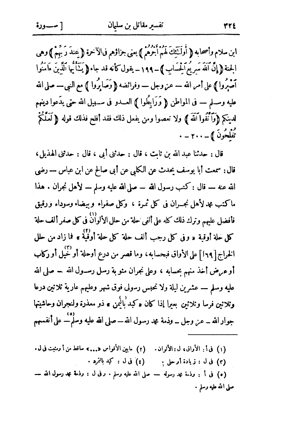 قَالَ: حَدَّثَنَا عَبْدُ اللَّهِ بْنُ ثَابِتٍ، قَالَ: حَدَّثَنِي أَبِي، قَالَ: حَدَّثَنِي الْهُذَيْلُ، قَالَ: سَمِعْتُ أَبَا يُوسُفَ يُحَدِّثُ عَنِ الْكَلْبِيِّ عَنْ أَبِي صَالِحٍ عَنِ ابْنِ عَبَّاسٍ- رَضِيَ اللَّهُ عَنْهُ- قَالَ: كَتَبَ رَسُولُ اللَّهِ- صَلَّى اللَّهُ عَلَيْهِ وَسَلَّمَ- لأَهْلِ نَجْرَانَ. هَذَا مَا كَتَبَ مُحَمَّدٌ لأَهْلِ نَجْرَانَ فِي كُلِّ ثَمَرَةٍ، وَكُلِّ صَفْرَاءَ وَبَيْضَاءَ وَسَوْدَاءَ وَرَقِيقٍ فَأَفْضَلَ عَلَيْهِمْ وَتَرَكَ ذلك كله على ألفى حلة كل حُلَلِ الأَلْوَانِ «1» فِي كُلِّ صَفَرٍ أَلْفُ حُلَّةٍ كُلُّ حُلَّةٍ أُوقِيَّةٌ «وَفِي كُلِّ رَجَبٍ أَلْفُ حُلَّةٍ كُلُّ حُلَّةٍ أُوقِيَّةٌ» «2» فَمَا زَادَ مِنْ حلل الخراج [69 أ] عَلَى الأَوَاقِ فَبِحِسَابِهِ، وَمَا قَصُرَ مِنْ دِرْعٍ أَوْ حُلَّةٍ أَوْ خَيْلٍ «3» أَوْ رِكَابٍ أَوْ عِرْضٍ أُخِذَ مِنْهُمْ بِحِسَابِهِ، وَعَلَى نَجْرَانَ مَثُوبَةُ رُسُلِ رَسُولِ اللَّهِ- صَلَّى اللَّهُ عَلَيْهِ وَسَلَّمَ- عِشْرِينَ لَيْلَةً وَلا تَحْبِسُ رَسُولِي فَوْقَ شَهْرٍ وَعَلَيْهِمْ عَارِيَةُ ثَلاثِينَ دِرْعًا وَثَلاثِينَ فَرَسًا وَثَلاثِينَ بَعِيرًا إِذَا كَانَ «كُبِّدَ «4» بِالْيَمَنِ» ذُو مَعْذِرَةٍ وَلِنَجْرَانَ وَحَاشِيَتِهَا جِوَارُ اللَّهِ- عَزَّ وَجَلَّ- وَذِمَّةُ محمد رسول الله- صلى الله عليه وسلم- «5» علي أنفسهم