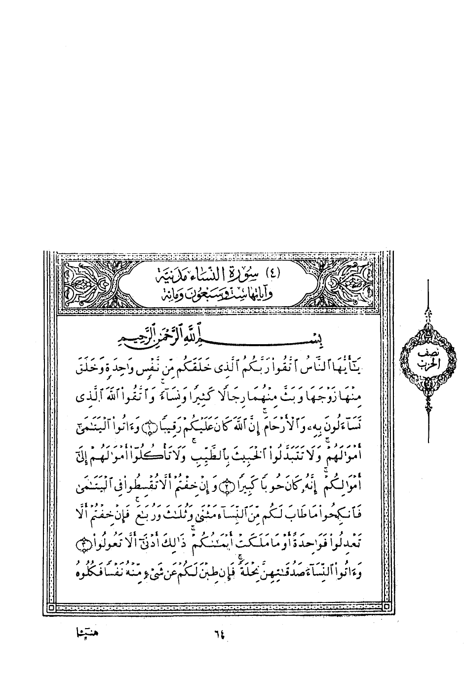 يا أَيُّهَا النَّاسُ اتَّقُوا رَبَّكُمُ الَّذِي خَلَقَكُمْ مِنْ نَفْسٍ واحِدَةٍ وَخَلَقَ مِنْها زَوْجَها وَبَثَّ مِنْهُما رِجالاً كَثِيراً وَنِساءً وَاتَّقُوا اللَّهَ الَّذِي تَسائَلُونَ بِهِ وَالْأَرْحامَ إِنَّ اللَّهَ كانَ عَلَيْكُمْ رَقِيباً (1) وَآتُوا الْيَتامى أَمْوالَهُمْ وَلا تَتَبَدَّلُوا الْخَبِيثَ بِالطَّيِّبِ وَلا تَأْكُلُوا أَمْوالَهُمْ إِلى أَمْوالِكُمْ إِنَّهُ كانَ حُوباً كَبِيراً (2) وَإِنْ خِفْتُمْ أَلاَّ تُقْسِطُوا فِي الْيَتامى فَانْكِحُوا مَا طابَ لَكُمْ مِنَ النِّساءِ مَثْنى وَثُلاثَ وَرُباعَ فَإِنْ خِفْتُمْ أَلاَّ تَعْدِلُوا فَواحِدَةً أَوْ مَا مَلَكَتْ أَيْمانُكُمْ ذلِكَ أَدْنى أَلاَّ تَعُولُوا (3) وَآتُوا النِّساءَ صَدُقاتِهِنَّ نِحْلَةً فَإِنْ طِبْنَ لَكُمْ عَنْ شَيْءٍ مِنْهُ نَفْساً فَكُلُوهُ هَنِيئاً مَرِيئاً (4)