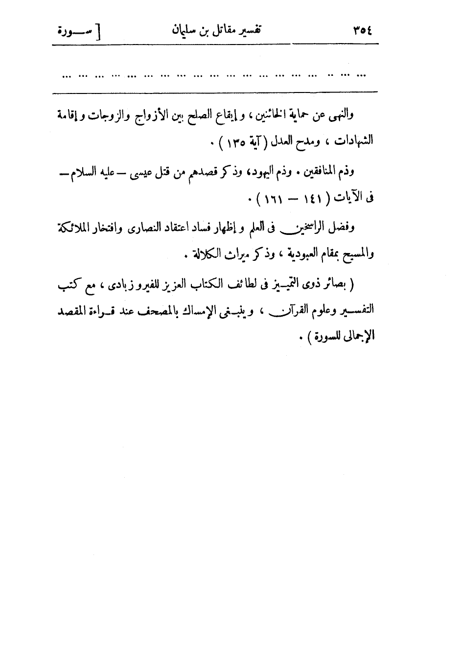 والنهى عن حماية الخائنين، وإيقاع الصلح بين الأزواج والزوجات وإقامة الشهادات، ومدح العدل (آية 135) .