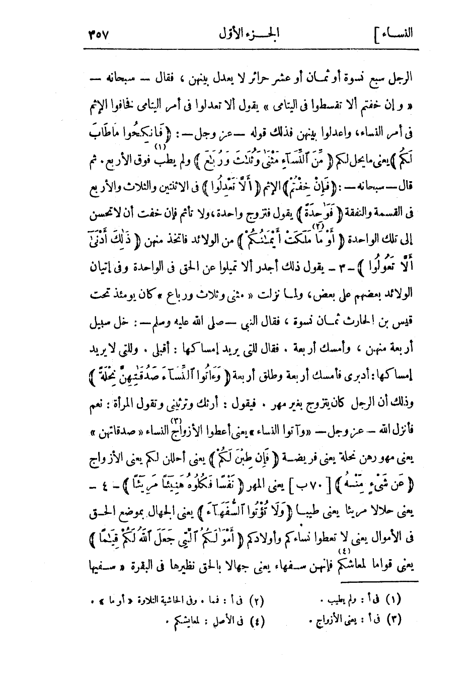 الرَّجُل سبع نسوة أو ثمان أَوْ عشر حرائر لا يعدل بينهن، فَقَالَ- سُبْحَانَهُ- وَإِنْ خِفْتُمْ أَلَّا تُقْسِطُوا فِي الْيَتامى يَقُولُ ألا تعدلوا فِي أمر اليتامى فخافوا الإثم فِي أمر النّساء، واعدلوا بينهن فذلك قوله- عَزَّ وَجَلّ-: فَانْكِحُوا مَا طابَ لَكُمْ يعني ما يحل لَكُمْ مِنَ النِّساءِ مَثْنى وَثُلاثَ وَرُباعَ وَلَم يطب «1» فوق الأربع. ثُمّ قَالَ- سُبْحَانَهُ-: فَإِنْ خِفْتُمْ الإثم أَلَّا تَعْدِلُوا فى الاثنتين والثلاث والأربع فِي القسمة والنفقة فَواحِدَةً يَقُولُ فتزوج واحدة، وَلا تأثم فَإِن خفت أن لا تحسن إلى تِلْكَ الواحدة أَوْ مَا «2» مَلَكَتْ أَيْمانُكُمْ من الولائد فاتخذ منهن ذلِكَ أَدْنى أَلَّا تَعُولُوا- 3- يَقُولُ ذَلِكَ أجدر ألا تميلوا عن الحق فِي الواحدة وَفِي إتيان الولائد بعضهم عَلَى بعض، ولما نزلت مَثْنى وَثُلاثَ وَرُباعَ