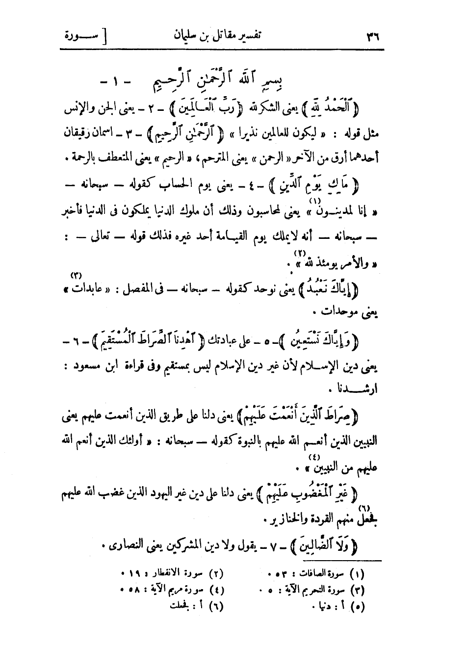 بِسْمِ اللَّهِ الرَّحْمنِ الرَّحِيمِ- 1- الْحَمْدُ لِلَّهِ يعني الشكر للَّه رَبِّ الْعالَمِينَ- 2- يعني الجن والإنس مثل قوله: لِيَكُونَ لِلْعالَمِينَ نَذِيراً الرَّحْمنِ الرَّحِيمِ- 3- اسمان رقيقان أَحَدهمَا أرق من الآخر الرَّحْمنِ يعني المترحم، الرَّحِيمِ يعني المتعطف بالرحمة.