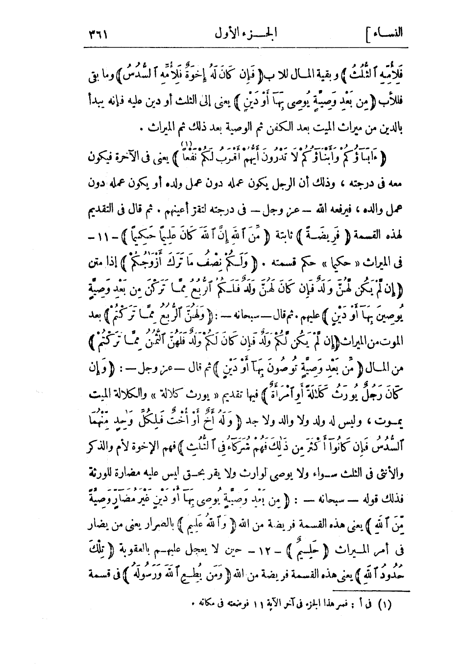 آباؤُكُمْ وَأَبْناؤُكُمْ لا تَدْرُونَ أَيُّهُمْ أَقْرَبُ لَكُمْ نَفْعاً «1» يعني فِي الآخرة فيكون معه فِي درجته، وذلك أن الرَّجُل يَكُون عمله دون عمل ولده أَوْ يَكُون عمله دون عمل والده، فيرفعه اللَّه- عَزَّ وَجَلّ- فِي درجته لتقر أعينهم. ثُمّ قَالَ فِي التقديم لهذه القسمة فَرِيضَةً ثابتة مِنَ اللَّهِ إِنَّ اللَّهَ كانَ عَلِيماً حَكِيماً- 11- فِي الميراث «حَكِيماً» حكم قسمته. وَلَكُمْ نِصْفُ ما تَرَكَ أَزْواجُكُمْ إذا متن إِنْ لَمْ يَكُنْ لَهُنَّ وَلَدٌ فَإِنْ كانَ لَهُنَّ وَلَدٌ فَلَكُمُ الرُّبُعُ مِمَّا تَرَكْنَ مِنْ بَعْدِ وَصِيَّةٍ يُوصِينَ بِها أَوْ دَيْنٍ عليهم. ثُمّ قَالَ- سُبْحَانَهُ-: وَلَهُنَّ الرُّبُعُ مِمَّا تَرَكْتُمْ بعد الموت من الميراث إِنْ لَمْ يَكُنْ لَكُمْ وَلَدٌ فَإِنْ كانَ لَكُمْ وَلَدٌ فَلَهُنَّ الثُّمُنُ مِمَّا تَرَكْتُمْ من المال مِنْ بَعْدِ وَصِيَّةٍ تُوصُونَ بِها أَوْ دَيْنٍ ثُمّ قَالَ- عَزَّ وَجَلّ-: وَإِنْ كانَ رَجُلٌ يُورَثُ كَلالَةً أَوِ امْرَأَةٌ فيها تقديم يُورَثُ كَلالَةً والكلالة الميت يموت، وليس لَهُ وَلَد وَلا والد وَلا جد وَلَهُ أَخٌ أَوْ أُخْتٌ فَلِكُلِّ واحِدٍ مِنْهُمَا السُّدُسُ فَإِنْ كانُوا أَكْثَرَ مِنْ ذلِكَ فَهُمْ شُرَكاءُ فِي الثُّلُثِ فهم الإخوة لأم والذكر والأنثى فِي الثلث سواء وَلا يوصي لوارث وَلا يقر بحق لَيْسَ عَلَيْه مضارة للورثة فذلك قوله- سُبْحَانَهُ-: مِنْ بَعْدِ وَصِيَّةٍ يُوصى بِها أَوْ دَيْنٍ غَيْرَ مُضَارٍّ وَصِيَّةً مِنَ اللَّهِ يعني هَذِهِ القسمة فريضة من اللَّه وَاللَّهُ عَلِيمٌ بالضرار يعني من يضار فِي أمر الميراث حَلِيمٌ- 12- حين لا يعجل عليهم بالعقوبة تِلْكَ حُدُودُ اللَّهِ يعني هَذِهِ القسمة فريضة من اللَّه وَمَنْ يُطِعِ اللَّهَ وَرَسُولَهُ فى قسمة