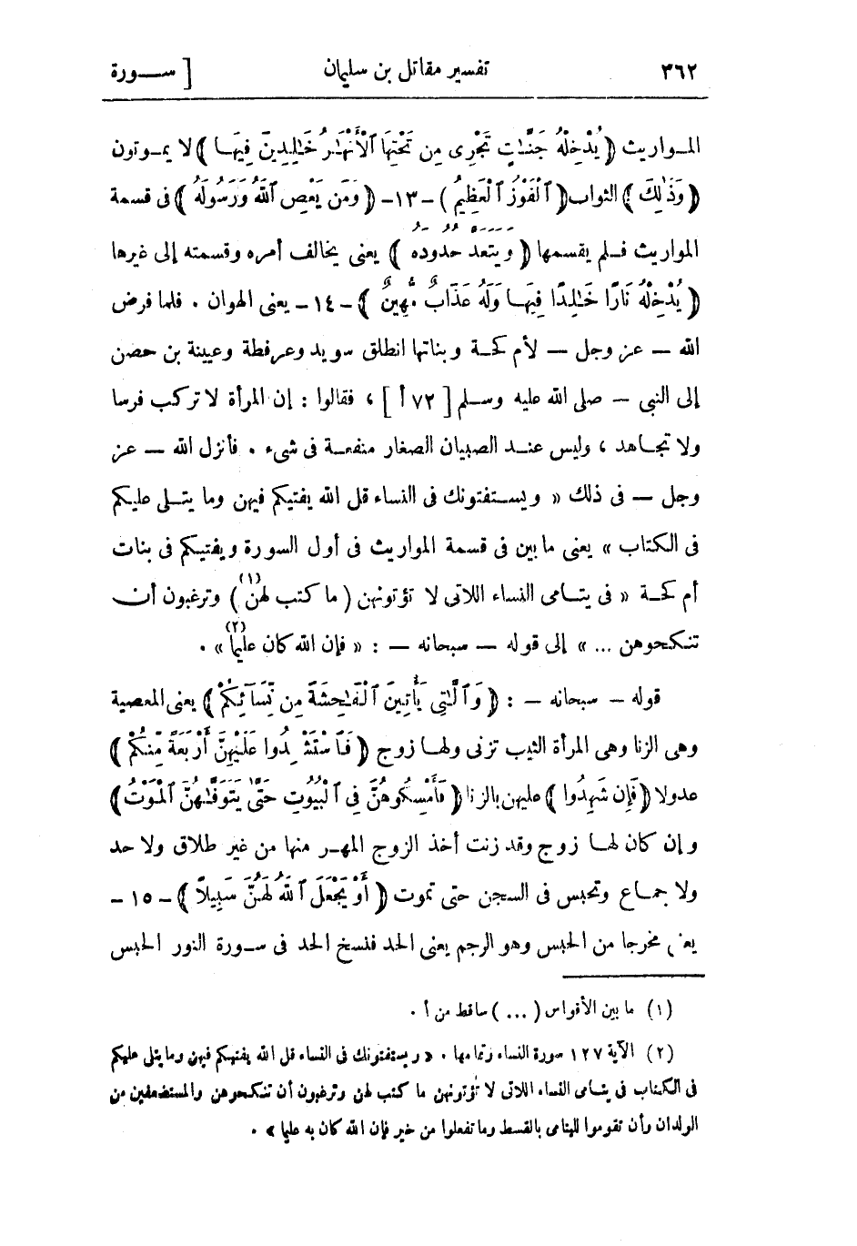 المواريث يُدْخِلْهُ جَنَّاتٍ تَجْرِي مِنْ تَحْتِهَا الْأَنْهارُ خالِدِينَ فِيها لا يموتون وَذلِكَ الثواب الْفَوْزُ الْعَظِيمُ- 13- وَمَنْ يَعْصِ اللَّهَ وَرَسُولَهُ فِي قسمة المواريث فلم يقسمها وَيَتَعَدَّ حُدُودَهُ يعني يخالف أمره وقسمته إلى غيرها يُدْخِلْهُ ناراً خالِداً فِيها وَلَهُ عَذابٌ مُهِينٌ- 14- يعني الهوان. فَلَمَّا فرض اللَّه- عَزَّ وَجَلّ- لأم كحة وبناتها انطلق سُوَيْد وعرفطة وعيينة بن حصن إلى النَّبِيّ- صَلَّى اللَّهُ عَلَيْهِ وسلم [72 أ] ، فقالوا: إن المرأة لا تركب فرسا وَلا تجاهد، وليس عِنْد الصبيان الصغار منفعة فِي شيء. فأنزل اللَّه- عَزَّ وَجَلّ- فِي ذَلِكَ وَيَسْتَفْتُونَكَ فِي النِّساءِ قُلِ اللَّهُ يُفْتِيكُمْ فِيهِنَّ وَما يُتْلى عَلَيْكُمْ فِي الْكِتابِ يعني ما بين فِي قسمة المواريث فِي أول السورة ويفتيكم فِي بنات أم كحة فِي يَتامَى النِّساءِ اللَّاتِي لا تُؤْتُونَهُنَّ (مَا كُتِبَ لَهُنَّ) «1» وَتَرْغَبُونَ أَنْ تَنْكِحُوهُنَّ ... إلى قوله- سُبْحَانَهُ-: فَإِنَّ اللَّهَ كانَ بِهِ عَلِيماً «2» .