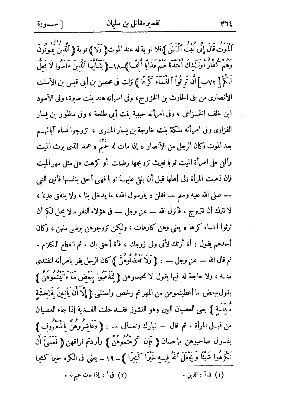 ثُمّ قَالَ اللَّه- عَزَّ وَجَلّ-: وَلا تَعْضُلُوهُنَّ كان الرَّجُل يفر بامرأته لتفتدى منه، وَلا حاجة لَهُ فيها يَقُولُ لا تحبسوهن لِتَذْهَبُوا بِبَعْضِ ما آتَيْتُمُوهُنَّ يَقُولُ ببعض ما أعطيتموهن من المهر ثُمّ رخص واستثنى إِلَّا أَنْ يَأْتِينَ بِفاحِشَةٍ مُبَيِّنَةٍ يعني العصيان البين وَهُوَ النشوز فقد حلت الفدية إذا جاء العصيان من قبل المرأة. ثُمّ قَالَ- تبارك وتعالى-: وَعاشِرُوهُنَّ بِالْمَعْرُوفِ يَقُولُ صاحبوهن بإحسان فَإِنْ كَرِهْتُمُوهُنَّ وأردتم فراقهن فَعَسى أَنْ تَكْرَهُوا شَيْئاً وَيَجْعَلَ اللَّهُ فِيهِ خَيْراً كَثِيراً- 19- يعنى فى الكره خيرا كثيرا