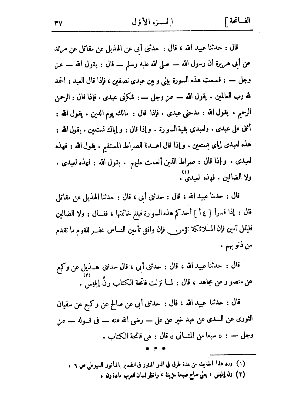 قَالَ: حَدَّثَنَا عُبَيْدُ اللَّهِ، قَالَ: حَدَّثَنِي أَبِي عَنْ صَالِحٍ عَنْ وَكِيعٍ عَنْ سُفْيَانَ الثَّوْرِيِّ عَنْ السُّدِّيِّ عَنْ عَبْدِ خَيْرٍ عَنْ عَلِيٍّ- رَضِيَ اللَّهُ عَنْهُ- فِي قَوْلِهِ- عَزَّ وَجَلَّ-: سَبْعاً مِنَ الْمَثانِي قال: هي فاتحة الكتاب.