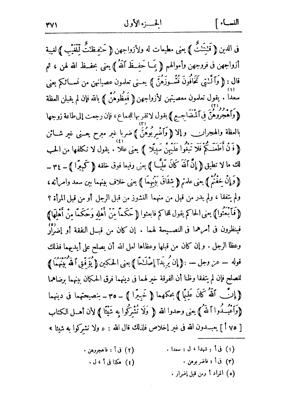 فِي الدّين قانِتاتٌ يعني مطيعات لَهُ ولأزواجهن حافِظاتٌ لِلْغَيْبِ لغيبة أزواجهن فِي فروجهن وأموالهم بِما حَفِظَ اللَّهُ يعني بحفظ اللَّه لهن، ثُمّ قَالَ: وَاللَّاتِي تَخافُونَ نُشُوزَهُنَّ يعني تعلمون عصيانهن من نسائكم يعني سعدا «1» . يَقُولُ تعلمون معصيتهن لأزواجهن فَعِظُوهُنَّ بِاللَّه فَإِن لم يقبلن العظة وَاهْجُرُوهُنَّ «2» فِي الْمَضاجِعِ يَقُولُ لا تقربها للجماع، فَإِن رجعت إلى طاعة زوجها بالعظة والهجران وإلا وَاضْرِبُوهُنَّ «3» ضربا غَيْر مبرح يعني غَيْر شائن فَإِنْ أَطَعْنَكُمْ فَلا تَبْغُوا عَلَيْهِنَّ سَبِيلًا يعنى عللا «4» . يقول لا تكلفها من الحب لك ما لا تطيق إِنَّ اللَّهَ كانَ عَلِيًّا يعني رفيعا فوق خلقه كَبِيراً- 34- وَإِنْ خِفْتُمْ يعني علمتم شِقاقَ بَيْنِهِما يعني خلاف بَيْنَهُمَا بين سعد وامرأته، وَلَم يتفقا، وَلَم يدر من قبل من منهما النشوز من قبل الرَّجُل أَوْ من قبل المرأة؟