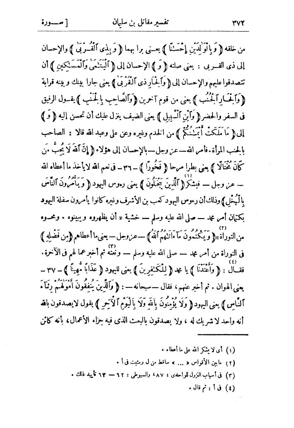 من خلقه وَبِالْوالِدَيْنِ إِحْساناً يعني برا بهما وَبِذِي الْقُرْبى والإحسان إلى ذِي القربى: يعني صلته (و) الإحسان إلى الْيَتامى وَالْمَساكِينِ أن تتصدقوا عليهم والإحسان إلى وَالْجارِ ذِي الْقُرْبى يعني جارا بينك وبينه قرابة وَالْجارِ الْجُنُبِ يعني من قوم آخرين وَالصَّاحِبِ بِالْجَنْبِ يَقُولُ الرفيق فِي السَّفَر والحضر وَابْنِ السَّبِيلِ يعني الضيف ينزل عليك أن تحسن إليه (و) إلى ما مَلَكَتْ أَيْمانُكُمْ من الخدم وغيره وعن علي وعبد الله قالا: الصاحب بالجنب المرأة. فأمر اللَّه- عَزَّ وَجَلّ- بالإحسان إلى هَؤُلاءِ إِنَّ اللَّهَ لا يُحِبُّ مَنْ كانَ مُخْتالًا يعني بطرا مرحا فَخُوراً- 36- فِي نعم اللَّه لا يأخذ ما أعطاه اللَّه- عَزَّ وَجَلّ- فيشكر «1» الَّذِينَ يَبْخَلُونَ يعني رءوس اليهود وَيَأْمُرُونَ النَّاسَ بِالْبُخْلِ وذلك أن رءوس اليهود كَعْب بن الأشرف وغيره كانوا يأمرون سفلة اليهود بكتمان أمر محمد- صَلَّى اللَّهُ عَلَيْهِ وَسَلَّمَ- خشية «أن يظهروه ويبينوه. ومحوه من التوراة» «2» وَيَكْتُمُونَ مَا آتاهُمُ اللَّهُ- عَزَّ وَجَلّ- يعني ما أعطاهم مِنْ فَضْلِهِ فِي التوراة من أمرُ محمدٍ- صَلَّى اللَّهُ عَلَيْهِ وَسَلَّمَ- ونعتُه «3» ثُمّ أخبر عما لهم فِي الآخرة.