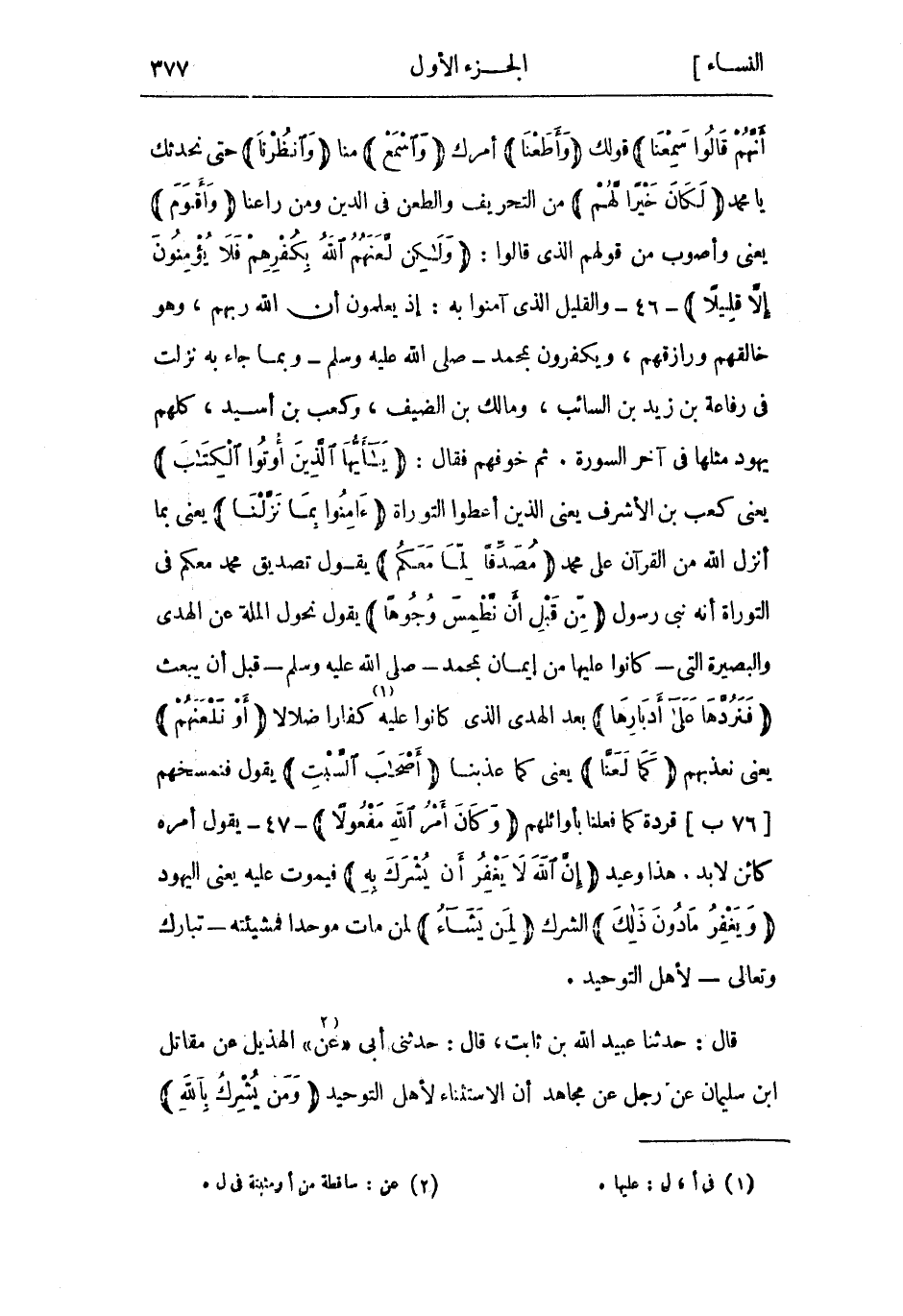 وَلَوْ أَنَّهُمْ قالُوا سَمِعْنا قولك وَأَطَعْنا أمرك وَاسْمَعْ مِنَّا وَانْظُرْنا حَتَّى نحدثك يا محمد لَكانَ خَيْراً لَهُمْ من التحريف والطعن فِي الدّين ومن راعنا وَأَقْوَمَ يعني وأصوب من قولهم الَّذِي قَالُوا: وَلكِنْ لَعَنَهُمُ اللَّهُ بِكُفْرِهِمْ فَلا يُؤْمِنُونَ إِلَّا قَلِيلًا- 46- والقليل الَّذِي آمنوا به: إذ يعلمون أن اللَّه ربهم، وَهُوَ خالقهم ورازقهم، ويكفرون بمحمد- صلى الله عليه وسلم- وبما جاء به نزلت فِي رفاعة بن زَيْد بن السّائب، ومالك بن الضيف، وكعب بن أُسَيْد، كلهم يهود مثلها فى آخر السورة. ثم خوفهم فقال: يا أَيُّهَا الَّذِينَ أُوتُوا الْكِتابَ يعني كَعْب بن الأشرف يعني الَّذِين أعطوا التوراة آمِنُوا بِما نَزَّلْنا يعني بما أنزل اللَّه من القرآن عَلَى محمد مُصَدِّقاً لِما مَعَكُمْ يَقُولُ تصديق محمد معكم فِي التوراة أَنَّهُ نَبِيّ رسول مِنْ قَبْلِ أَنْ نَطْمِسَ وُجُوهاً يَقُولُ نحول الملة عن الهدى والبصيرة التي- كانوا عَلَيْهَا من إيمان بمحمد- صَلَّى اللَّهُ عَلَيْهِ وَسَلَّمَ- قبل أن يبعث فَنَرُدَّها عَلى أَدْبارِها بعد الهدى الَّذِي كانوا عَلَيْه «1» كفارا ضلالا أَوْ نَلْعَنَهُمْ يعني نعذبهم كَما لَعَنَّا يعني كما عذبنا أَصْحابَ السَّبْتِ يقول فنمسخهم [76 ب] قردة كَمَا فعلنا بأوائلهم وَكانَ أَمْرُ اللَّهِ مَفْعُولًا- 47- يَقُولُ أمره كائن لا بد. هَذَا وعيد إِنَّ اللَّهَ لا يَغْفِرُ أَنْ يُشْرَكَ بِهِ فيموت عَلَيْه يعني اليهود وَيَغْفِرُ مَا دُونَ ذلِكَ الشرك لِمَنْ يَشاءُ لمن مات موحدا فمشيئته- تبارك وتعالى- لأهل التوحيد.