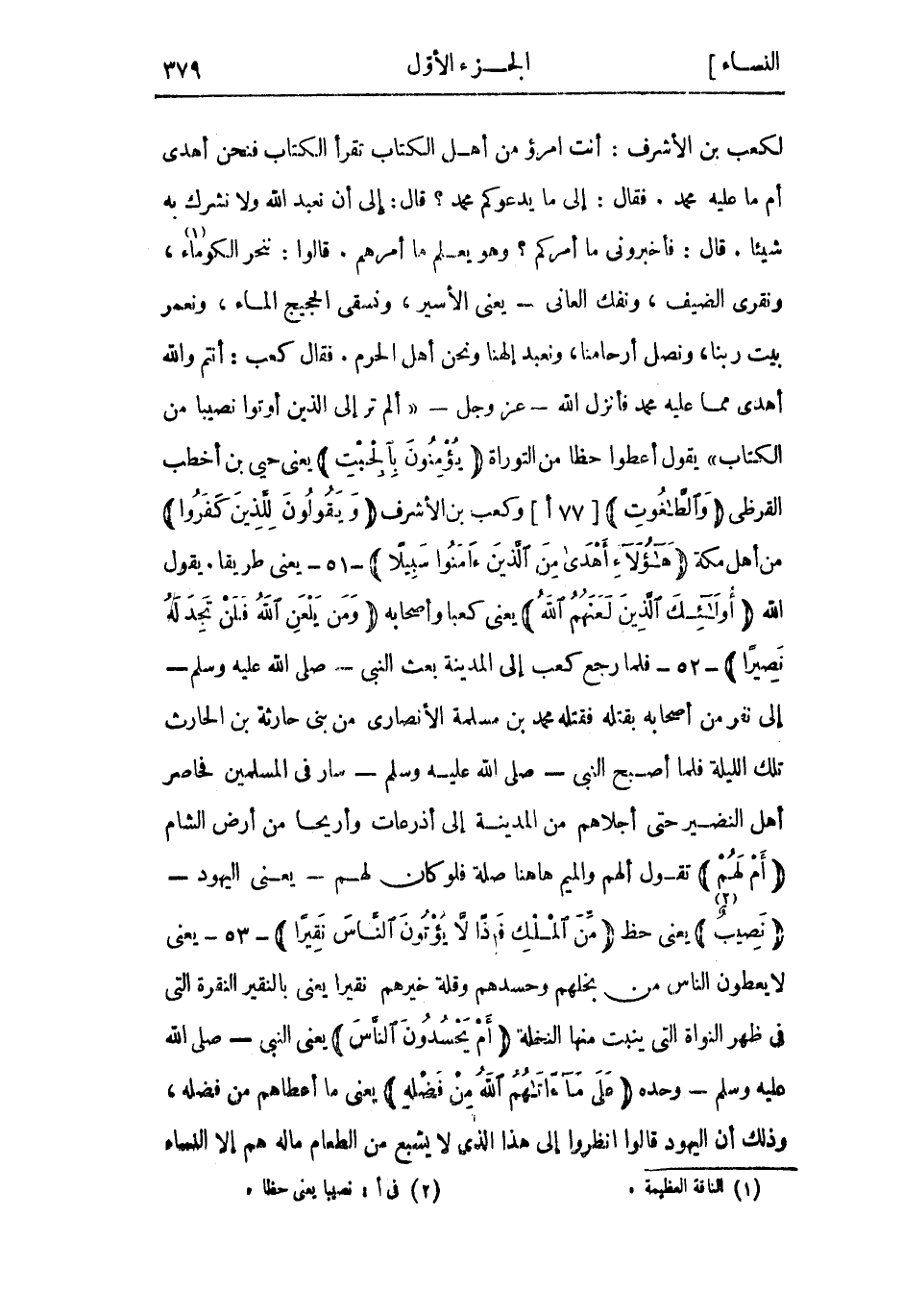 لكعب بن الأشرف: أَنْت امرؤ من أَهْل الكتاب تقرأ الكتاب فنحن أهدى أم ما عَلَيْه محمد. فَقَالَ: إلى ما يدعوكم محمد؟ قَالَ: إِلَى أن نعبد اللَّه وَلا نشرك به شيئًا. قَالَ: فأخبروني ما أمركم؟ وَهُوَ يعلم ما أمرهم. قَالُوا: ننحر الكوماء «1» ، ونقري الضيف، ونفك العاني- يعني الأسير، ونسقي الحجيج الماء، ونعمر بيت ربنا، ونصل أرحامنا، ونعبد إلهنا ونحن أهل الحرم. فقال كعب: أنتم واللَّه أهدى مما عَلَيْه محمد فأنزل اللَّه- عَزَّ وَجَلّ-: أَلَمْ تَرَ إِلَى الَّذِينَ أُوتُوا نَصِيباً مِنَ الْكِتابِ يَقُولُ أعطوا حظا من التوراة يُؤْمِنُونَ بِالْجِبْتِ يعنى حيى بن أخطب القرظي وَالطَّاغُوتِ [77 أ] وكعب بن الأشرف وَيَقُولُونَ لِلَّذِينَ كَفَرُوا من أَهْل مكة هؤُلاءِ أَهْدى مِنَ الَّذِينَ آمَنُوا سَبِيلًا- 51- يعنى طريقا. يقول الله أُولئِكَ الَّذِينَ لَعَنَهُمُ اللَّهُ يعني كعبا وأصحابه وَمَنْ يَلْعَنِ اللَّهُ فَلَنْ تَجِدَ لَهُ نَصِيراً- 52- فَلَمَّا رجع كَعْب إلى المدينة بعث النَّبِيّ- صَلَّى اللَّهُ عَلَيْهِ وَسَلَّمَ- إلى نفر من أصحابه بقتله فقتله محمد بن مَسْلَمَةَ الْأَنْصَارِيّ من بنى حارثة بن الحاراث تِلْكَ الليلة فَلَمَّا أصبح النَّبِيّ- صَلَّى اللَّهُ عَلَيْهِ وَسَلَّمَ- سار فِي الْمُسْلِمِين فحاصر أَهْل النضير حَتَّى أجلاهم من المدينة إلى أذرعات وأريحا من أرض الشام أَمْ لَهُمْ تَقُولُ ألهم والميم هاهنا صلة فلو كان لهم- يعنى اليهود- نَصِيبٌ «2» يعنى حظ مِنَ الْمُلْكِ فَإِذاً لا يُؤْتُونَ النَّاسَ نَقِيراً- 53- يعني لا يعطون الناس من بخلهم وحسدهم وقلة خيرهم نقيرا يعني بالنقير النقرة التي فِي ظهر النواة التي ينبت منها النخلة أَمْ يَحْسُدُونَ النَّاسَ يعني النَّبِيّ- صَلَّى اللَّهُ عَلَيْهِ وَسَلَّمَ- وحده عَلى مَا آتاهُمُ اللَّهُ مِنْ فَضْلِهِ يعني ما أعطاهم من فضله، وذلك أن اليهود قَالُوا انظروا إلى هَذَا الَّذِي لا يشبع من الطعام ماله هم إلا النساء