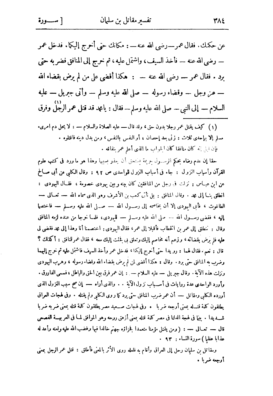 وأورد الواحدي عدة روايات فى أسباب نزول الآية.. والذي أراه- إن صح سبب النزول الذي أورده الكلبي ومقاتل- أن عمر ضرب المنافق حتى يرد كما روى الكلبي ولم يقتله. وفى لهجات العراق يطلقون كلمة قتله بمعنى أوجعه ضربا. وفى لهجات صعيد مصر يطلقون كلمة قتله بمعنى ضربه ضربا شديدا. بينما فى لهجة الدلتا فى مصر كلمة قتله بمعنى أزهق روحه وهو الموافق لما فى العربية الفصحى قال- تعالى-: وَمَنْ يَقْتُلْ مُؤْمِناً مُتَعَمِّداً فَجَزاؤُهُ جَهَنَّمُ خالِداً فِيها وَغَضِبَ اللَّهُ عَلَيْهِ وَلَعَنَهُ وَأَعَدَّ لَهُ عَذاباً عَظِيماً سورة النساء: 93.