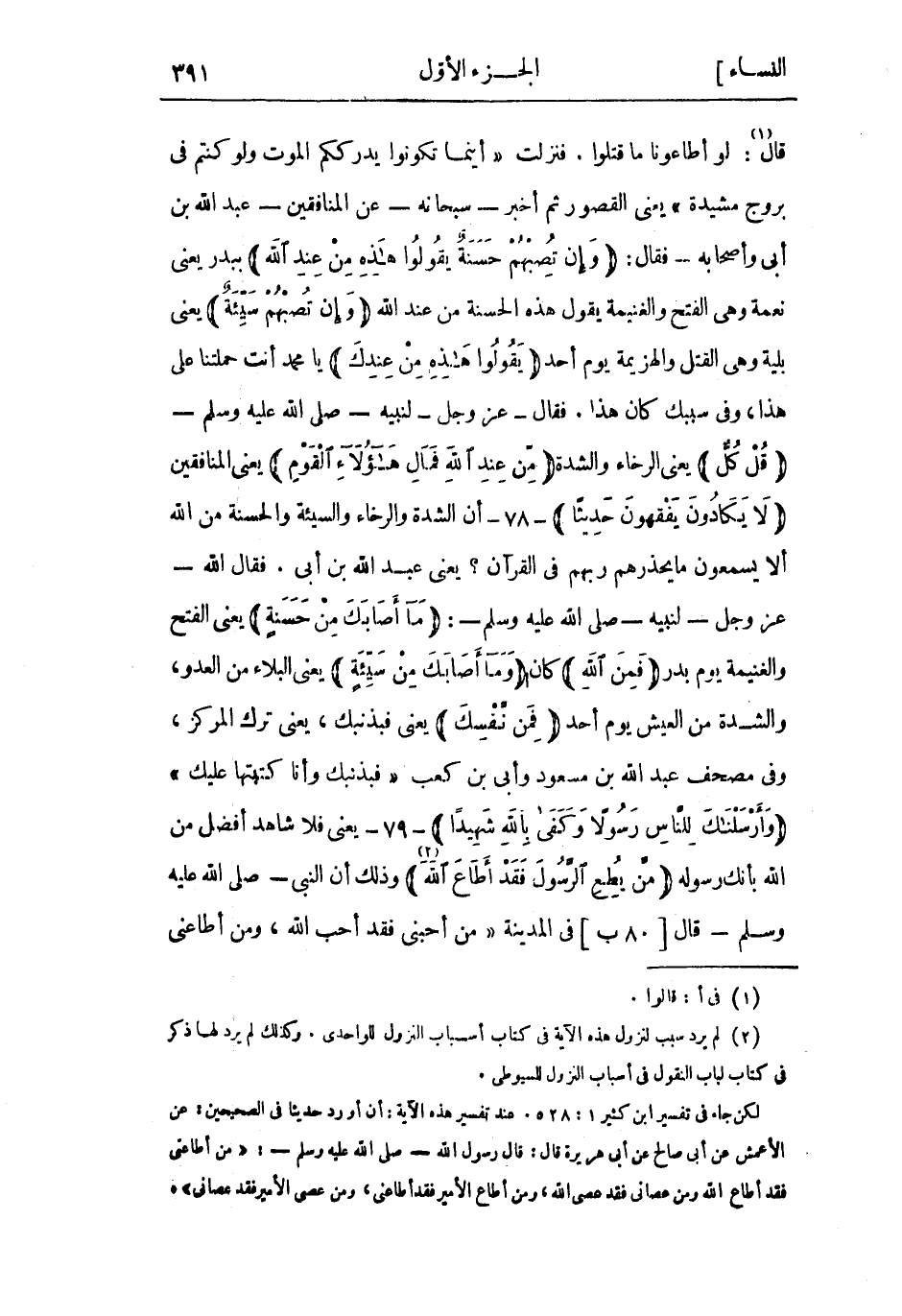 قَالَ «1» : لو أطاعونا ما قتلوا. فنزلت أَيْنَما تَكُونُوا يُدْرِكْكُمُ الْمَوْتُ وَلَوْ كُنْتُمْ فِي بُرُوجٍ مُشَيَّدَةٍ يعني القصور ثُمّ أخبر- سُبْحَانَهُ- عن المنافقين- عَبْد اللَّه بن أُبَيٍّ وأصحابه- فَقَالَ: وَإِنْ تُصِبْهُمْ حَسَنَةٌ يَقُولُوا هذِهِ مِنْ عِنْدِ اللَّهِ ببدر يعني نعمة وهي الفتح والغنيمة يَقُولُ هَذِهِ الحسنة من عِنْد اللَّه وَإِنْ تُصِبْهُمْ سَيِّئَةٌ يعني بلية وهي القتل والهزيمة يوم أحد يَقُولُوا هذِهِ مِنْ عِنْدِكَ يا محمد أَنْت حملتنا عَلَى هَذَا، وَفِي سببك كان هَذَا. فَقَالَ- عَزَّ وَجَلّ- لنبيه- صَلَّى اللَّهُ عَلَيْهِ وَسَلَّمَ- قُلْ كُلٌّ يعني الرخاء والشدة مِنْ عِنْدِ اللَّهِ فَمالِ هؤُلاءِ الْقَوْمِ يعنى المنافقين لا يَكادُونَ يَفْقَهُونَ حَدِيثاً- 78- أن الشدة والرخاء والسيئة والحسنة من اللَّه ألا يسمعون ما يحذرهم ربهم فِي القرآن؟ يعنى عبد الله بن أبى. فقال الله- عز وجل- لنبيه- صلى الله عليه وسلم-: ما أَصابَكَ مِنْ حَسَنَةٍ يعني الفتح والغنيمة يوم بدر فَمِنَ اللَّهِ كان وَما أَصابَكَ مِنْ سَيِّئَةٍ يعني البلاء من العدو، والشدة من العيش يوم أحد فَمِنْ نَفْسِكَ يعني فبذنبك، يعني ترك المركز، وَفِي مصحف عَبْد اللَّه بن مَسْعُود وأبي بن كَعْب «فبذنبك وأنا كتبتها عليك» وَأَرْسَلْناكَ لِلنَّاسِ رَسُولًا وَكَفى بِاللَّهِ شَهِيداً- 79- يعني فلا شاهد أفضل من اللَّه بأنك رسوله مَنْ يُطِعِ الرَّسُولَ فَقَدْ أَطاعَ اللَّهَ «2» وذلك