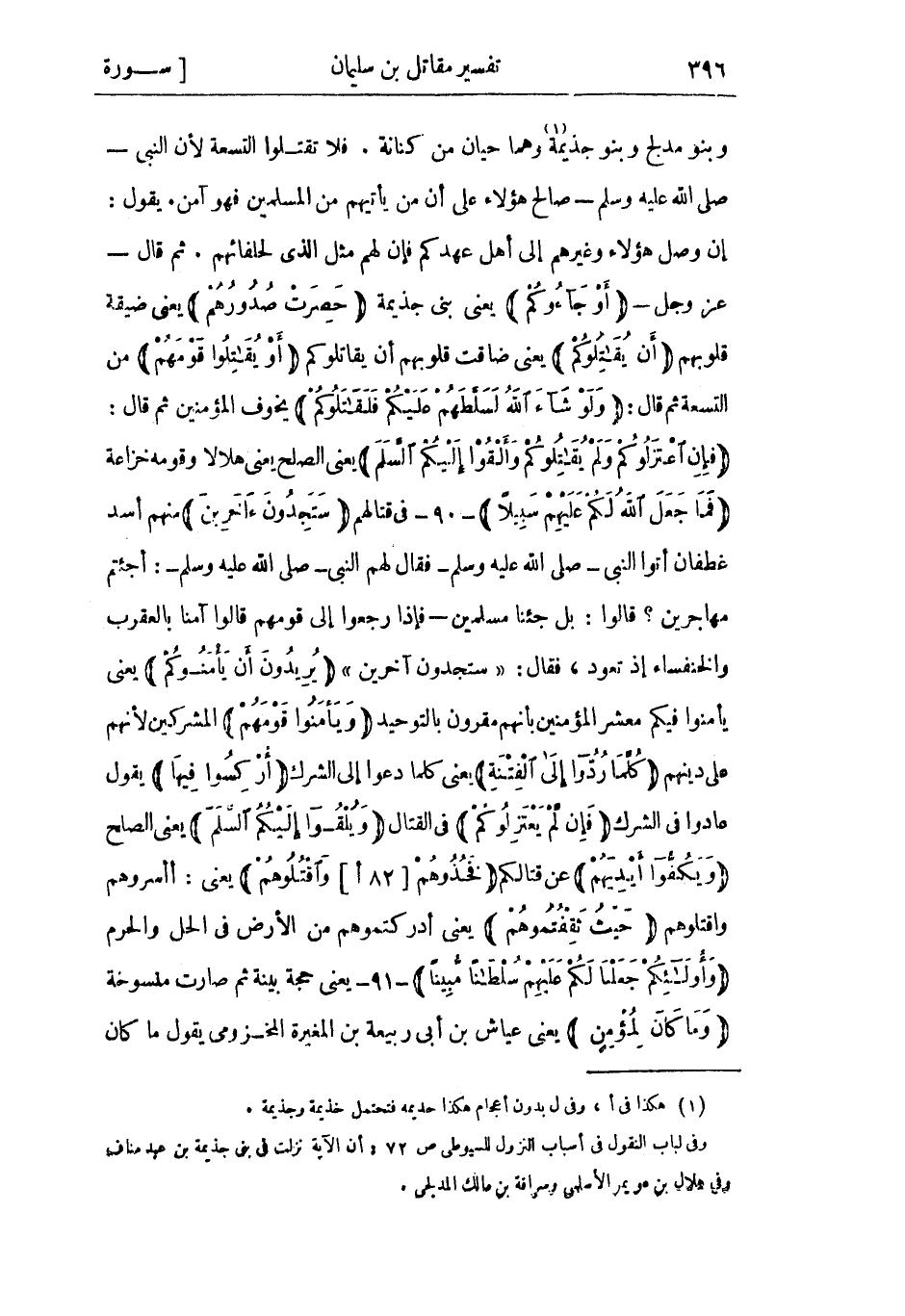يعني يأمنوا فيكم مَعْشَر الْمُؤْمِنِين بأنهم مقرون بالتوحيد وَيَأْمَنُوا قَوْمَهُمْ المشركين لأنهم عَلَى دينهم كُلَّما رُدُّوا إِلَى الْفِتْنَةِ يعني كلما دعوا إلى الشرك أُرْكِسُوا فِيها يَقُولُ عادوا فِي الشرك فَإِنْ لَمْ يَعْتَزِلُوكُمْ فى القتال وَيُلْقُوا إِلَيْكُمُ السَّلَمَ يعني الصلح وَيَكُفُّوا أَيْدِيَهُمْ عن قتالكم فَخُذُوهُمْ وَاقْتُلُوهُمْ [82 أ] يعنى: أأسروهم واقتلوهم حَيْثُ ثَقِفْتُمُوهُمْ يعني أدركتموهم من الأرض فِي الحل والحرم وَأُولئِكُمْ جَعَلْنا لَكُمْ عَلَيْهِمْ سُلْطاناً مُبِيناً- 91- يعنى حجة بيّنة ثم صارت منسوخة وَما كانَ لِمُؤْمِنٍ يعني عَيَّاش بن أَبِي رَبِيعَة بن المغيرة المخزومي يقول ما كان
