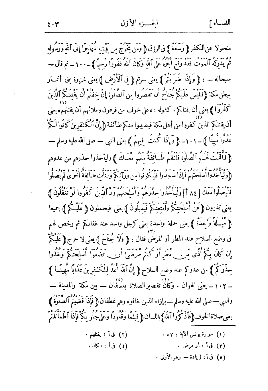 متحولا عن الكفر وَسَعَةً فِي الرزق وَمَنْ يَخْرُجْ مِنْ بَيْتِهِ مُهاجِراً إِلَى اللَّهِ وَرَسُولِهِ ثُمَّ يُدْرِكْهُ الْمَوْتُ فَقَدْ وَقَعَ أَجْرُهُ عَلَى اللَّهِ وَكانَ اللَّهُ غَفُوراً رَحِيماً- 100- ثُمّ قَالَ- سُبْحَانَهُ-: وَإِذا ضَرَبْتُمْ يعني سرتم فِي الْأَرْضِ يعني غزوة بني أنمار ببطن مكة فَلَيْسَ عَلَيْكُمْ جُناحٌ أَنْ تَقْصُرُوا مِنَ الصَّلاةِ إِنْ خِفْتُمْ أَنْ يَفْتِنَكُمُ الَّذِينَ كَفَرُوا يعني أن يقتلكم. كقوله: عَلى خَوْفٍ مِنْ فِرْعَوْنَ وَمَلَائِهِمْ أَنْ يَفْتِنَهُمْ «1» يعني أن يقتلكم الَّذِين «2» كفروا من أَهْل مكة فيصيبوا منكم طائفة إِنَّ الْكافِرِينَ كانُوا لَكُمْ عَدُوًّا مُبِيناً- 101- وَإِذا كُنْتَ فِيهِمْ يعني النَّبِيّ- صَلَّى اللَّهُ عَلَيْهِ وَسَلَّمَ- فَأَقَمْتَ لَهُمُ الصَّلاةَ فَلْتَقُمْ طائِفَةٌ مِنْهُمْ مَعَكَ وَلْيَأْخُذُوا حذرهم من عدوهم وَلْيَأْخُذُوا أَسْلِحَتَهُمْ فَإِذا سَجَدُوا فَلْيَكُونُوا مِنْ وَرائِكُمْ وَلْتَأْتِ طائِفَةٌ أُخْرى لَمْ يُصَلُّوا فَلْيُصَلُّوا مَعَكَ وَلْيَأْخُذُوا حِذْرَهُمْ وَأَسْلِحَتَهُمْ وَدَّ الَّذِينَ كَفَرُوا لَوْ تَغْفُلُونَ [84 أ] يعنى تذرون عَنْ أَسْلِحَتِكُمْ وَأَمْتِعَتِكُمْ فَيَمِيلُونَ يعني فيحملون عَلَيْكُمْ جميعًا مَيْلَةً واحِدَةً يعني حملة واحدة يعني كرجل واحد عِنْد غفلتكم ثُمّ رخص لهم فِي وضع السلاح عِنْد المطر أَو المرض «3» فَقَالَ: وَلا جُناحَ يعني لا حرج عَلَيْكُمْ إِنْ كانَ بِكُمْ أَذىً مِنْ مَطَرٍ أَوْ كُنْتُمْ مَرْضى أَنْ تَضَعُوا أَسْلِحَتَكُمْ وَخُذُوا حِذْرَكُمْ