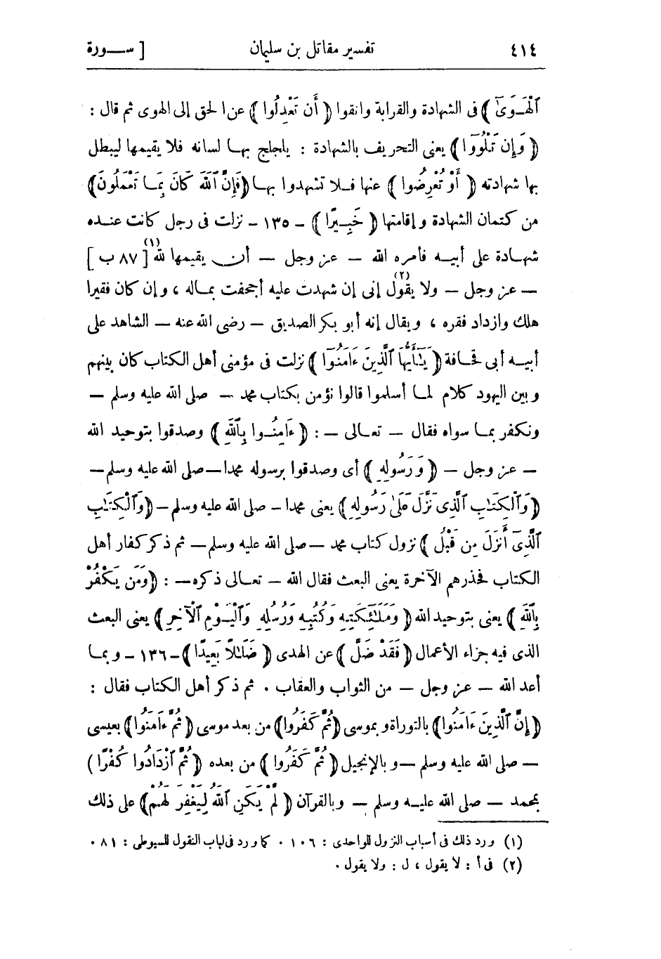 وَإِنْ تَلْوُوا يعني التحريف بالشهادة: يلجلج بها لسانه فلا يقيمها ليبطل بها شهادته أَوْ تُعْرِضُوا عَنْهَا فلا تشهدوا بها فَإِنَّ اللَّهَ كانَ بِما تَعْمَلُونَ من كتمان الشهادة وإقامتها خَبِيراً- 135- نزلت فِي رجل كانت عنده شهادته عَلَى أَبِيهِ فأمره اللَّه- عَزَّ وَجَلّ- أن يقيمها لله «1» [87 ب]- عَزَّ وَجَلّ- وَلا يَقُولُ «2» إني إن شهدت عَلَيْه أجحفت بماله، وإن كان فقيرا هلك وازداد فقره، ويُقَالُ إنَّه أَبُو بكر الصِّدِّيق- رَضِيَ اللَّه عَنْهُ- الشاهد عَلَى أَبِيهِ أَبِي قحافة يا أَيُّهَا الَّذِينَ آمَنُوا نزلت فِي مؤمني أَهْل الكتاب كان بينهم وبَيْنَ اليهود كلام لَما أسلموا قَالُوا نؤمن بكتاب محمد- صَلَّى اللَّهُ عَلَيْهِ وَسَلَّمَ- ونكفر بما سواه فَقَالَ- تَعَالَى-: آمِنُوا بِاللَّهِ وصدقوا بتوحيد اللَّه- عَزَّ وَجَلّ- وَرَسُولِهِ أَيّ وصدقوا برسوله محمدا- صَلَّى اللَّهُ عَلَيْهِ وَسَلَّمَ- وَالْكِتابِ الَّذِي نَزَّلَ عَلى رَسُولِهِ يعني محمدا- صَلَّى اللَّهُ عَلَيْهِ وَسَلَّمَ- وَالْكِتابِ الَّذِي أَنْزَلَ مِنْ قَبْلُ نزول كتاب محمد- صَلَّى اللَّهُ عَلَيْهِ وَسَلَّمَ- ثُمّ ذكر كفار أَهْل الكتاب فحذرهم الآخرة يعني البعث فَقَالَ اللَّه- تَعَالَى ذكره-: وَمَنْ يَكْفُرْ بِاللَّهِ يعني بتوحيد اللَّه وَمَلائِكَتِهِ وَكُتُبِهِ وَرُسُلِهِ وَالْيَوْمِ الْآخِرِ يعني البعث الَّذِي فِيهِ جزاء الأعمال فَقَدْ ضَلَّ عن الهدى ضَلالًا بَعِيداً- 136- وبما أعد الله- عز وجل- من الثواب والعقاب. ثُمّ ذكر أَهْل الكتاب فَقَالَ: