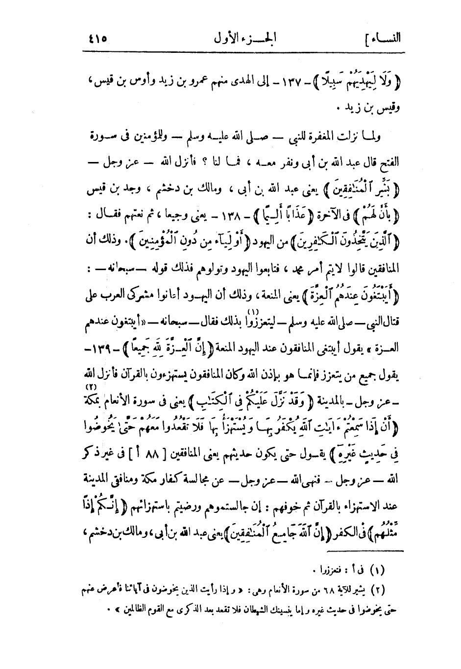 أَيَبْتَغُونَ عِنْدَهُمُ الْعِزَّةَ يعني المنعة، وذلك أن اليهود أعانوا مشركي العرب عَلَى قتال النَّبِيّ- صَلَّى اللَّهُ عَلَيْهِ وَسَلَّمَ- ليتعززوا «1» بِذَلِك فَقَالَ- سُبْحَانَهُ- «أَيَبْتَغُونَ عِنْدَهُمُ الْعِزَّةَ» يَقُولُ أيبتغي المنافقون عِنْد اليهود المنعة فَإِنَّ الْعِزَّةَ لِلَّهِ جَمِيعاً- 139- يَقُولُ جميع من يتعزز فَإِنَّمَا هُوَ بإذن الله وكان المنافقون يستهزءون بالقرآن فأنزل اللَّه- عَزَّ وَجَلّ- بالمدينة وَقَدْ نَزَّلَ عَلَيْكُمْ فِي الْكِتابِ يعنى فى سورة الأنعام بمكة «2» أَنْ إِذا سَمِعْتُمْ آياتِ اللَّهِ يُكْفَرُ بِها وَيُسْتَهْزَأُ بِها فَلا تَقْعُدُوا مَعَهُمْ حَتَّى يَخُوضُوا فِي حَدِيثٍ غَيْرِهِ يقول حتى يكون حديثهم يعنى المنافقين [88 أ] فِي غَيْر ذكر اللَّه- عَزَّ وَجَلّ- فنهى اللَّه- عَزَّ وَجَلّ- عن مجالسة كفار مكة ومنافقي المدينة عِنْد الاستهزاء بالقرآن ثُمّ خوفهم: إن جالستموهم ورضيتم باستهزائهم إِنَّكُمْ إِذاً مِثْلُهُمْ فى الكفر إِنَّ اللَّهَ جامِعُ الْمُنافِقِينَ يعني عَبْد اللَّه بن أُبَيٍّ، ومالك بن دخشم،