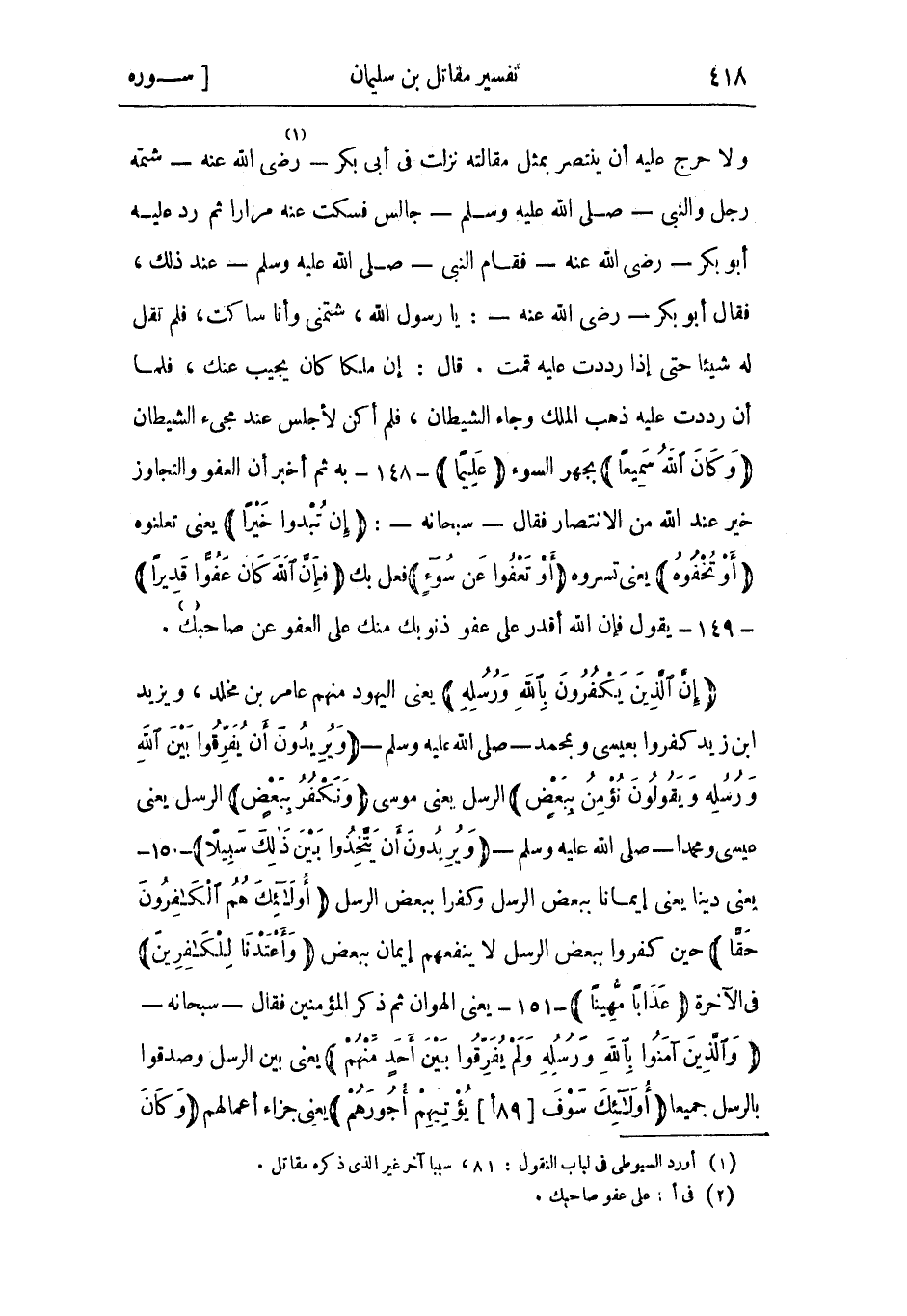 إِنَّ الَّذِينَ يَكْفُرُونَ بِاللَّهِ وَرُسُلِهِ يعني اليهود منهم عامر بن مَخْلَد، ويزيد ابن زَيْد كفروا بعيسى وبمحمد- صَلَّى اللَّهُ عَلَيْهِ وَسَلَّمَ- وَيُرِيدُونَ أَنْ يُفَرِّقُوا بَيْنَ اللَّهِ وَرُسُلِهِ وَيَقُولُونَ نُؤْمِنُ بِبَعْضٍ الرسل يعني مُوسَى وَنَكْفُرُ بِبَعْضٍ الرسل يعني عِيسَى ومحمدا- صَلَّى اللَّهُ عَلَيْهِ وَسَلَّمَ- وَيُرِيدُونَ أَنْ يَتَّخِذُوا بَيْنَ ذلِكَ سَبِيلًا- 150- يعنى دينا يعنى إيمانا ببعض الرسل وكفرا ببعض الرسل أُولئِكَ هُمُ الْكافِرُونَ حَقًّا حين كفروا ببعض الرسل لا ينفعهم إيمان ببعض وَأَعْتَدْنا لِلْكافِرِينَ فِي الآخرة عَذاباً مُهِيناً- 151- يعنى الهوان ثُمّ ذكر الْمُؤْمِنِين فَقَالَ- سُبْحَانَهُ- وَالَّذِينَ آمَنُوا بِاللَّهِ وَرُسُلِهِ وَلَمْ يُفَرِّقُوا بَيْنَ أَحَدٍ مِنْهُمْ يعني بين الرسل وصدقوا بالرسل جميعًا أُولئِكَ سَوْفَ يُؤْتِيهِمْ أُجُورَهُمْ [89 أ] يعني جزاء أعمالهم وَكانَ اللَّهُ غَفُوراً رَحِيماً