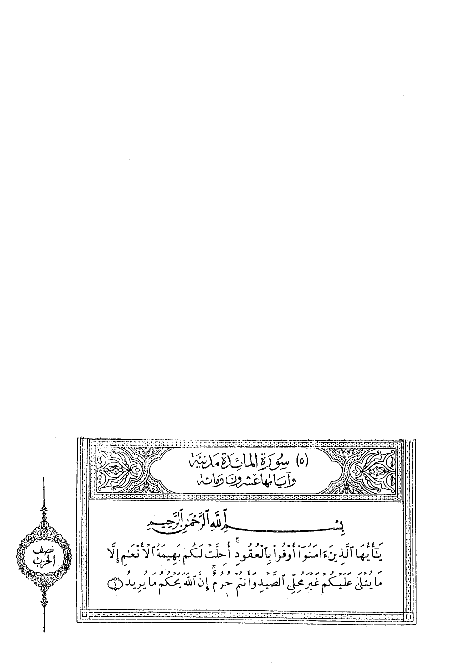 يا أَيُّهَا الَّذِينَ آمَنُوا أَوْفُوا بِالْعُقُودِ أُحِلَّتْ لَكُمْ بَهِيمَةُ الْأَنْعامِ إِلاَّ مَا يُتْلى عَلَيْكُمْ غَيْرَ مُحِلِّي الصَّيْدِ وَأَنْتُمْ حُرُمٌ إِنَّ اللَّهَ يَحْكُمُ مَا يُرِيدُ (1) يا أَيُّهَا الَّذِينَ آمَنُوا لا تُحِلُّوا شَعائِرَ اللَّهِ وَلا الشَّهْرَ الْحَرامَ وَلا الْهَدْيَ وَلا الْقَلائِدَ وَلا آمِّينَ الْبَيْتَ الْحَرامَ يَبْتَغُونَ فَضْلاً مِنْ رَبِّهِمْ وَرِضْواناً وَإِذا حَلَلْتُمْ فَاصْطادُوا وَلا يَجْرِمَنَّكُمْ شَنَآنُ قَوْمٍ أَنْ صَدُّوكُمْ عَنِ الْمَسْجِدِ الْحَرامِ أَنْ تَعْتَدُوا وَتَعاوَنُوا عَلَى الْبِرِّ وَالتَّقْوى وَلا تَعاوَنُوا عَلَى الْإِثْمِ وَالْعُدْوانِ وَاتَّقُوا اللَّهَ إِنَّ اللَّهَ شَدِيدُ الْعِقابِ (2) حُرِّمَتْ عَلَيْكُمُ الْمَيْتَةُ وَالدَّمُ وَلَحْمُ الْخِنْزِيرِ وَما أُهِلَّ لِغَيْرِ اللَّهِ بِهِ وَالْمُنْخَنِقَةُ وَالْمَوْقُوذَةُ وَالْمُتَرَدِّيَةُ وَالنَّطِيحَةُ وَما أَكَلَ السَّبُعُ إِلاَّ مَا ذَكَّيْتُمْ وَما ذُبِحَ عَلَى النُّصُبِ وَأَنْ تَسْتَقْسِمُوا بِالْأَزْلامِ ذلِكُمْ فِسْقٌ الْيَوْمَ يَئِسَ الَّذِينَ كَفَرُوا مِنْ دِينِكُمْ فَلا تَخْشَوْهُمْ وَاخْشَوْنِ الْيَوْمَ أَكْمَلْتُ لَكُمْ دِينَكُمْ وَأَتْمَمْتُ عَلَيْكُمْ نِعْمَتِي وَرَضِيتُ لَكُمُ الْإِسْلامَ دِيناً فَمَنِ اضْطُرَّ فِي مَخْمَصَةٍ غَيْرَ مُتَجانِفٍ لِإِثْمٍ فَإِنَّ اللَّهَ غَفُورٌ رَحِيمٌ (3) يَسْئَلُونَكَ مَاذَا أُحِلَّ لَهُمْ قُلْ أُحِلَّ لَكُمُ الطَّيِّباتُ وَما عَلَّمْتُمْ مِنَ الْجَوارِحِ مُكَلِّبِينَ تُعَلِّمُونَهُنَّ مِمَّا عَلَّمَكُمُ اللَّهُ فَكُلُوا مِمَّا أَمْسَكْنَ عَلَيْكُمْ وَاذْكُرُوا اسْمَ اللَّهِ عَلَيْهِ وَاتَّقُوا اللَّهَ إِنَّ اللَّهَ سَرِيعُ الْحِسابِ (4)